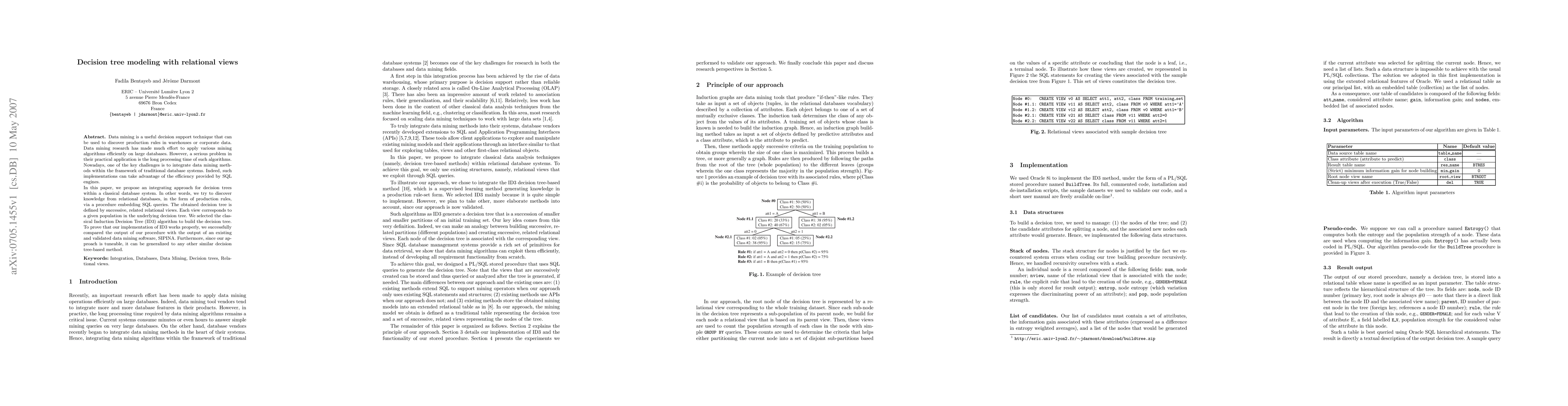 This paper proposes an approach to integrate decision tree modeling with relational views within traditional database systems, aiming to leverage SQL engines for efficiency. The method uses the ID3 algorithm to build decision trees from relational databases, with each tree defined by successive, related relational views, and is validated against existing data mining software.