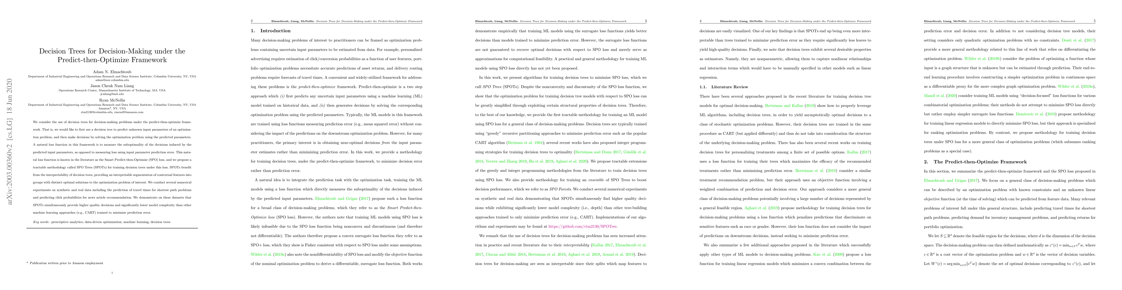 This paper proposes SPO Trees (SPOTs), a decision tree methodology for decision-making under the predict-then-optimize framework, which uses a Smart Predict-then-Optimize (SPO) loss function. SPOTs offer interpretability and better decision quality while reducing model complexity compared to traditional methods.