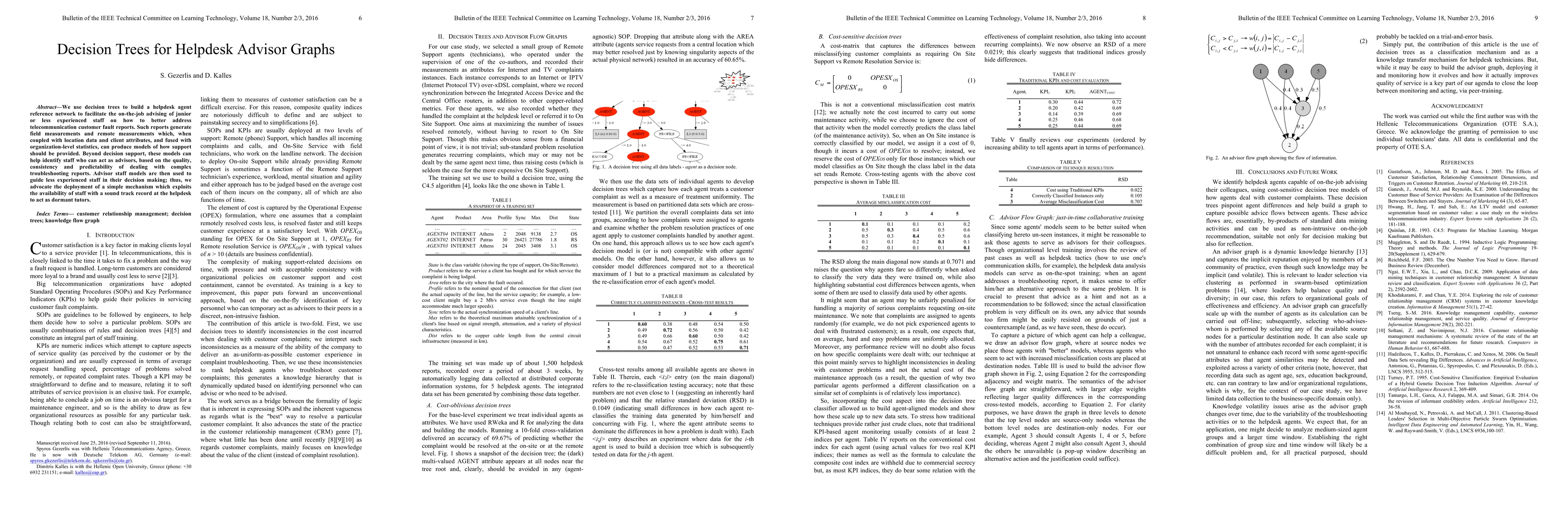 This research paper uses decision trees to create a helpdesk advisor network that suggests experienced staff can guide junior agents on complex troubleshooting reports. It proposes deploying these advisors as dormant tutors to improve customer service.