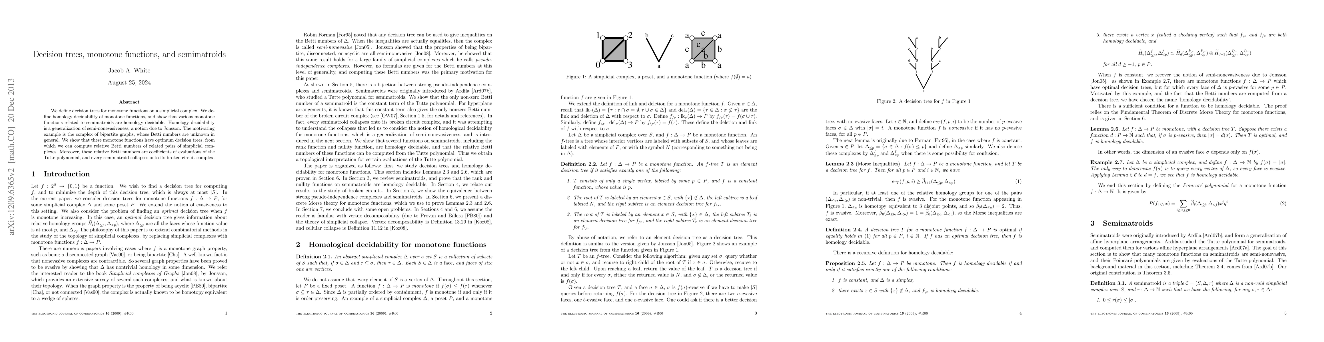 This paper defines decision trees for monotone functions on simplicial complexes and establishes homology decidability for various semimatroid-related functions. It demonstrates that these functions have optimal decision trees, enabling computation of relative Betti numbers, which are coefficients in the Tutte polynomial, and shows that semimatroids collapse onto their broken circuit complexes.