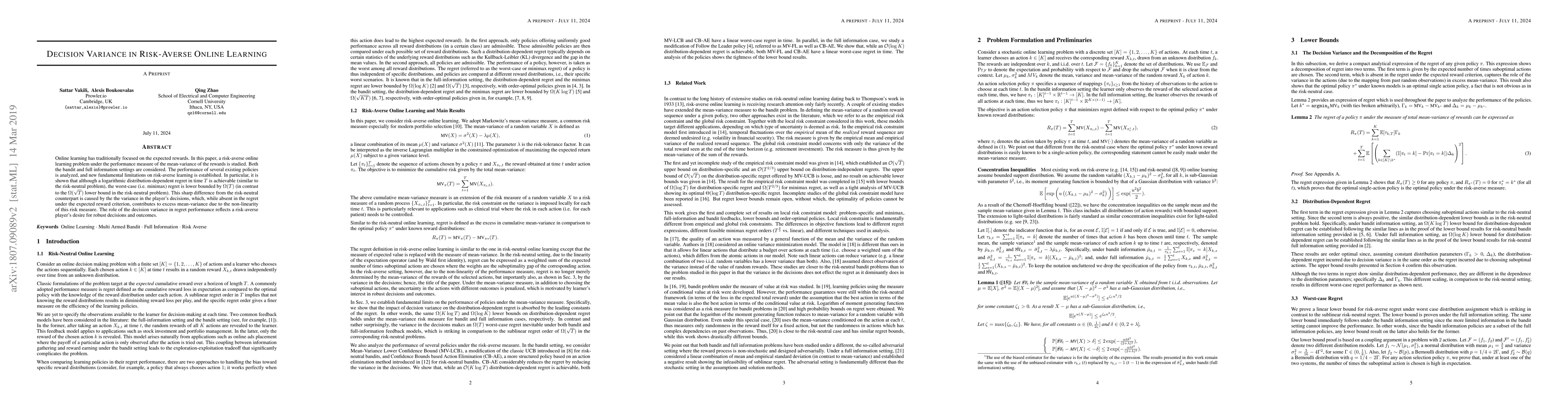 This paper investigates risk-averse online learning under the mean-variance performance measure, showing that while logarithmic regret is achievable, the worst-case regret is $\Omega(T)$, contrasting with the $\Omega(\sqrt{T})$ bound in risk-neutral settings due to the impact of decision variance.