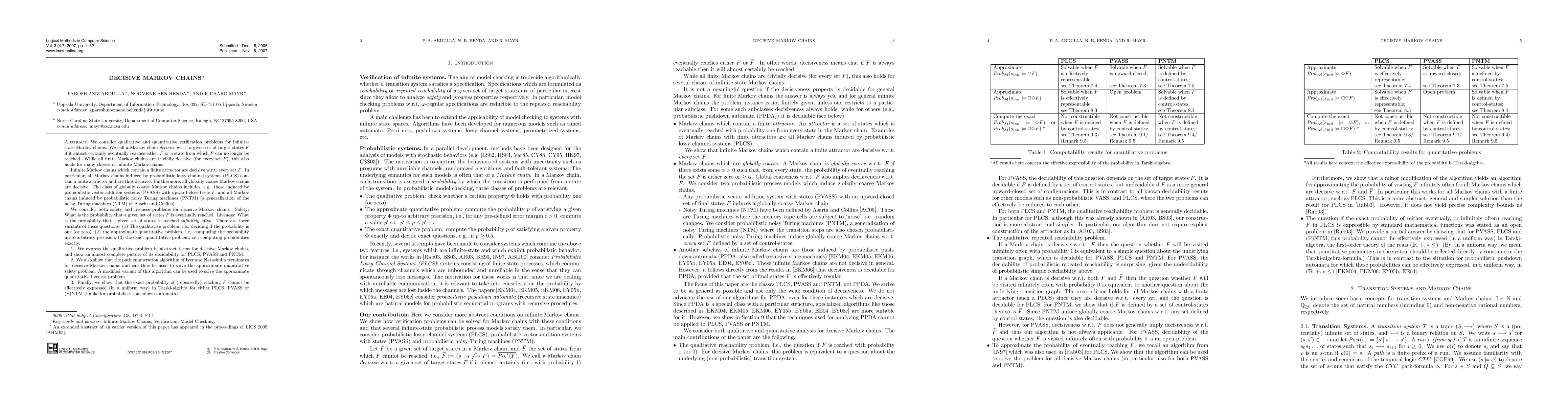 This paper investigates the decidability of verification problems for infinite-state Markov chains termed "decisive," which are guaranteed to reach a target state set or a state from which the target set can no longer be reached. It demonstrates that certain infinite Markov chains, including probabilistic lossy channel systems, vector addition systems, and noisy Turing machines, are decisive and explores both safety and liveness problems for these chains.