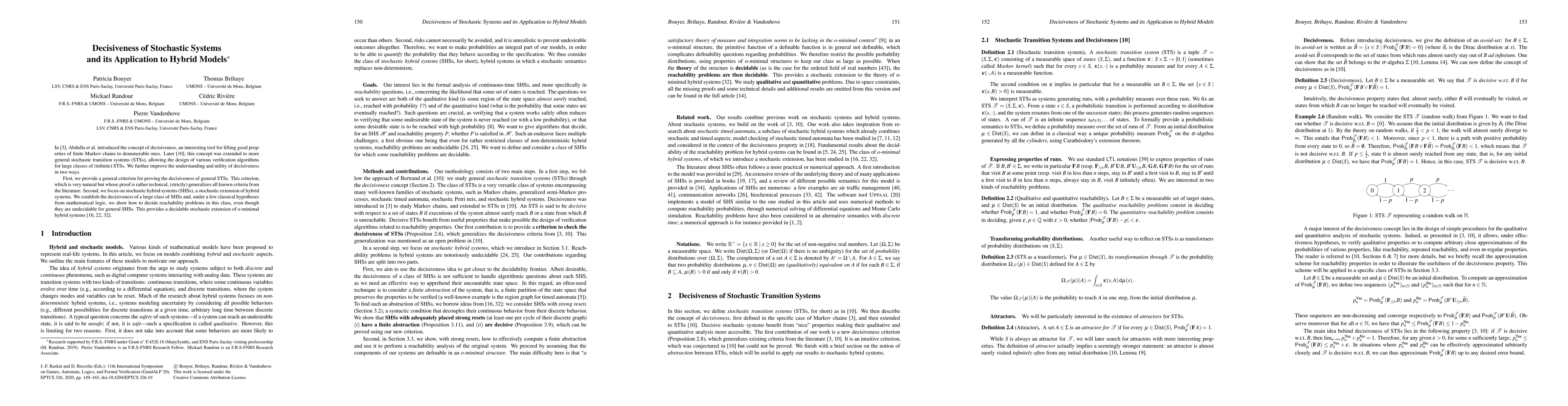 In [ABM07], Abdulla et al. introduced the concept of decisiveness, an interesting tool for lifting good properties of finite Markov chains to denumerable ones. Later, this concept was extended to more general stochastic transition systems (STSs), allowing the design of various verification algorithms for large classes of (infinite) STSs. We further improve the understanding and utility of decisiveness in two ways. First, we provide a general criterion for proving decisiveness of general STSs. This criterion, which is very natural but whose proof is rather technical, (strictly) generalizes all known criteria from the literature. Second, we focus on stochastic hybrid systems (SHSs), a stochastic extension of hybrid systems. We establish the decisiveness of a large class of SHSs and, under a few classical hypotheses from mathematical logic, we show how to decide reachability problems in this class, even though they are undecidable for general SHSs. This provides a decidable stochastic extension of o-minimal hybrid systems. [ABM07] Parosh A. Abdulla, Noomene Ben Henda, and Richard Mayr. 2007. Decisive Markov Chains. Log. Methods Comput. Sci. 3, 4 (2007).
