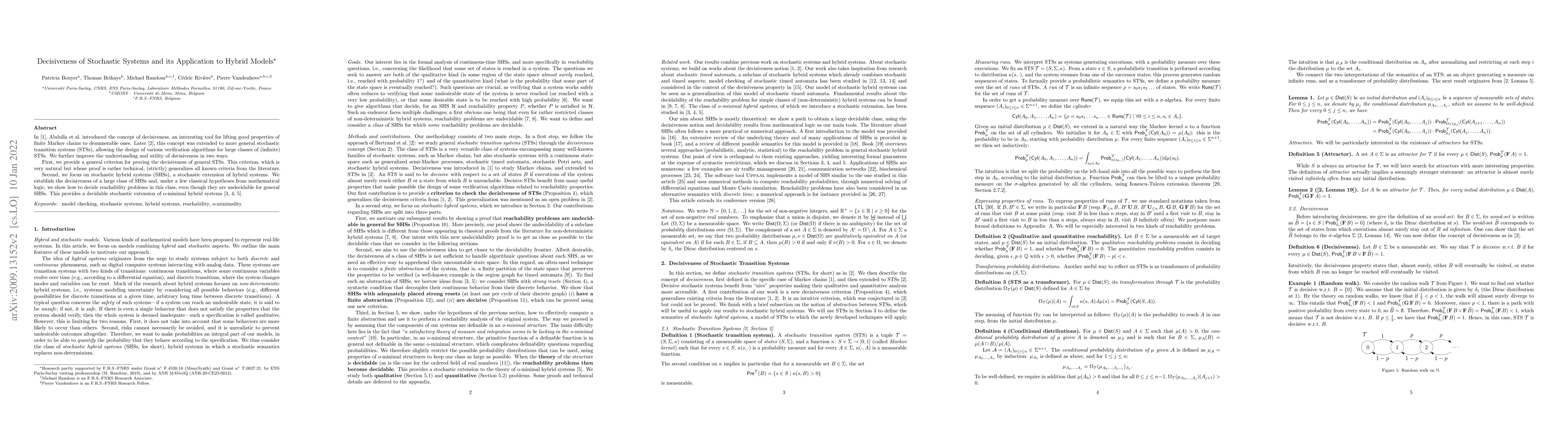 In [ABM07], Abdulla et al. introduced the concept of decisiveness, an interesting tool for lifting good properties of finite Markov chains to denumerable ones. Later, this concept was extended to more general stochastic transition systems (STSs), allowing the design of various verification algorithms for large classes of (infinite) STSs. We further improve the understanding and utility of decisiveness in two ways. First, we provide a general criterion for proving decisiveness of general STSs. This criterion, which is very natural but whose proof is rather technical, (strictly) generalizes all known criteria from the literature. Second, we focus on stochastic hybrid systems (SHSs), a stochastic extension of hybrid systems. We establish the decisiveness of a large class of SHSs and, under a few classical hypotheses from mathematical logic, we show how to decide reachability problems in this class, even though they are undecidable for general SHSs. This provides a decidable stochastic extension of o-minimal hybrid systems. [ABM07] Parosh A. Abdulla, Noomene Ben Henda, and Richard Mayr. 2007. Decisive Markov Chains. Log. Methods Comput. Sci. 3, 4 (2007).