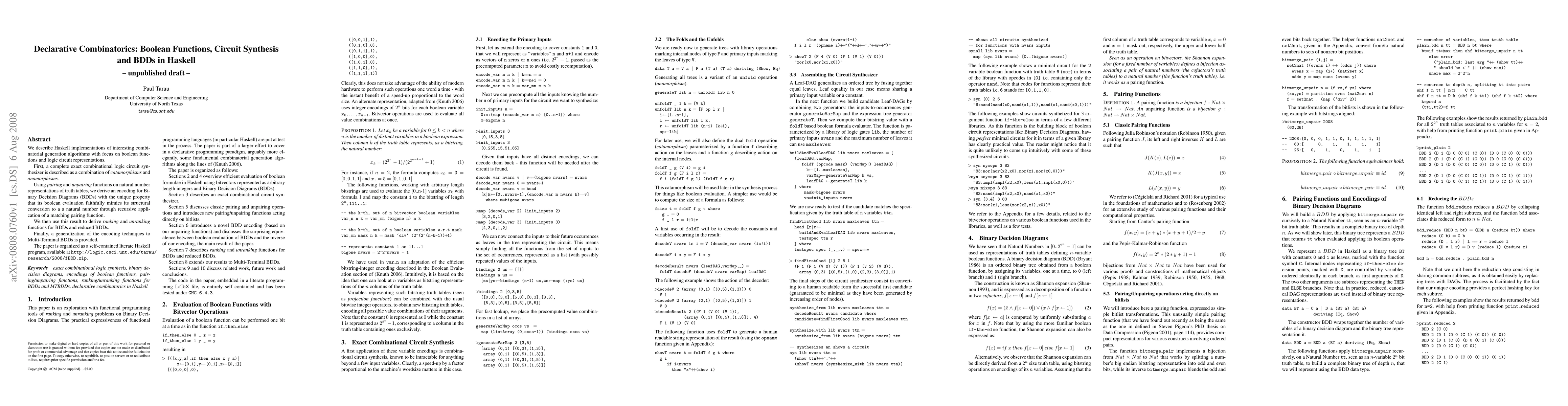 The paper describes Haskell implementations of combinatorial generation algorithms, focusing on boolean functions and logic circuit representations, using catamorphisms and anamorphisms.