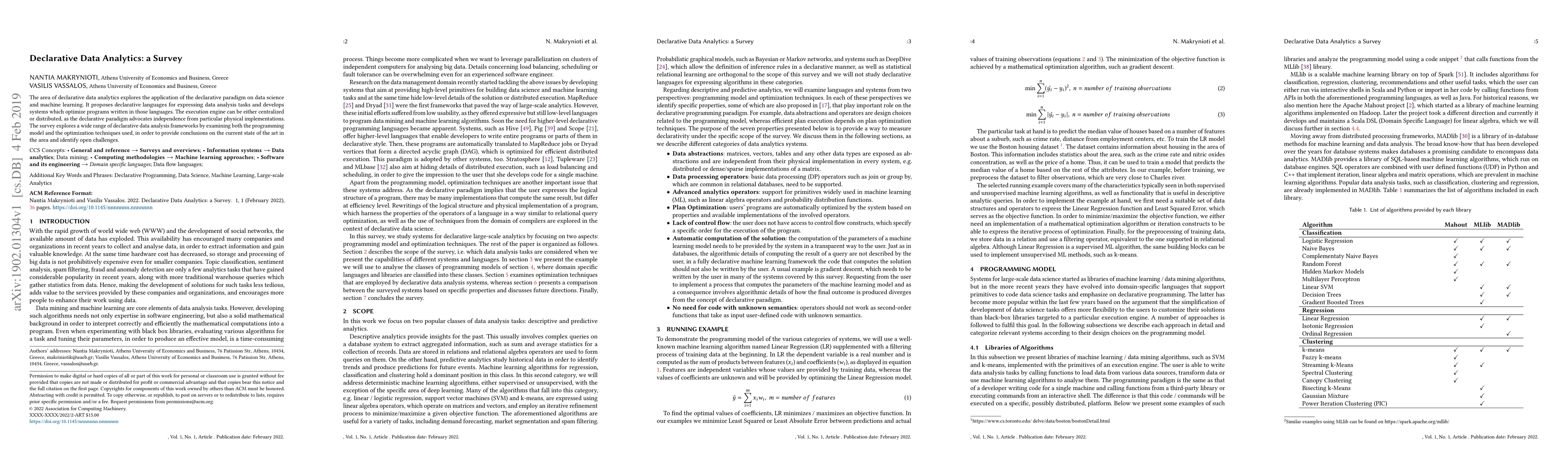 This survey investigates declarative data analytics, focusing on languages and systems that optimize data analysis tasks using the declarative paradigm, and evaluates current frameworks and optimization techniques to identify both advancements and challenges in the field.