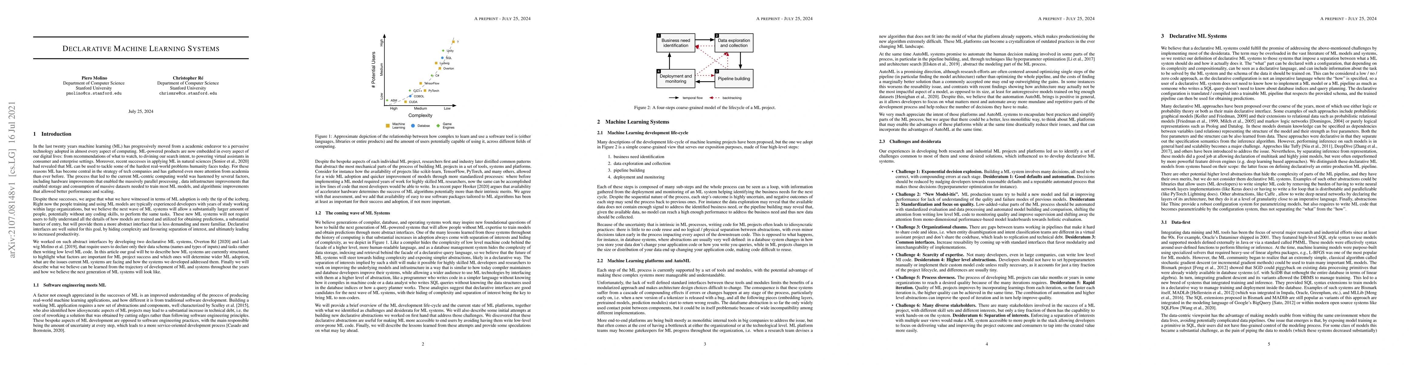 The paper introduces Overton and Ludwig, two declarative ML systems that simplify the ML development process by requiring users to declare only their data schema and tasks, abstracting low-level implementation details.
