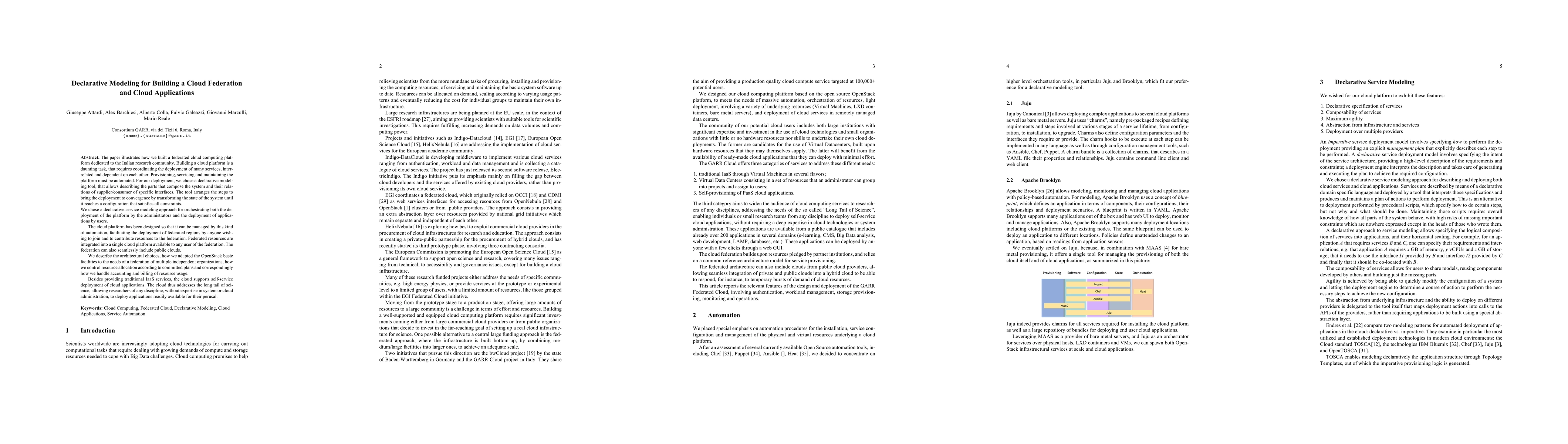 The paper details the development of a federated cloud computing platform for the Italian research community using a declarative modeling tool to automate deployment and service orchestration, and describes its integration of multiple independent organizations into a unified cloud environment, alongside resource management and application deployment capabilities.