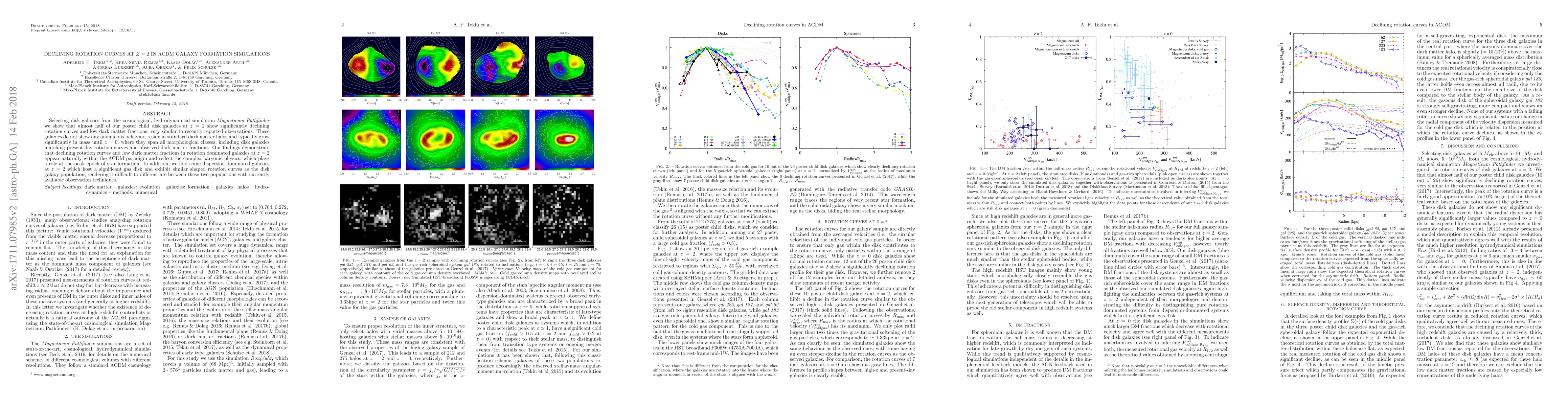 Selecting disk galaxies from the cosmological, hydrodynamical simulation Magneticum Pathfinder we show that almost half of our poster child disk galaxies at $z=2$ show significantly declining rotation curves and low dark matter fractions, very similar to recently reported observations. These galaxies do not show any anomalous behavior, reside in standard dark matter halos and typically grow significantly in mass until $z = 0$, where they span all morphological classes, including disk galaxies matching present day rotation curves and observed dark matter fractions. Our findings demonstrate that declining rotation curves and low dark matter fractions in rotation dominated galaxies at $z=2$ appear naturally within the $\Lambda$CDM paradigm and reflect the complex baryonic physics, which plays a role at the peak epoch of star-formation. In addition, we find some dispersion dominated galaxies at $z=2$ which host a significant gas disk and exhibit similar shaped rotation curves as the disk galaxy population, rendering it difficult to differentiate between these two populations with currently available observation techniques.