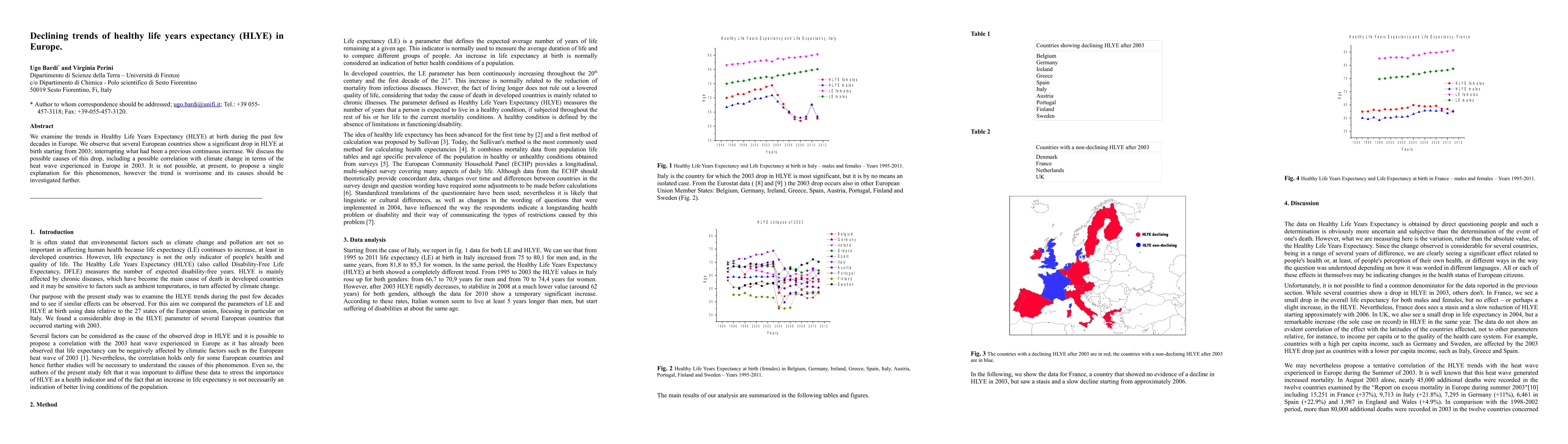 We examine the trends in Healthy Life Years Expectancy (HLYE) at birth during the past few decades in Europe. We observe that several European countries show a significant drop in HLYE at birth starting from 2003; interrupting what had been a previous continuous increase. We discuss the possible causes of this drop, including a possible correlation with climate change in terms of the heat wave experienced in Europe in 2003. It is not possible, at present, to propose a single explanation for this phenomenon, however the trend is worrisome and its causes should be investigated further.