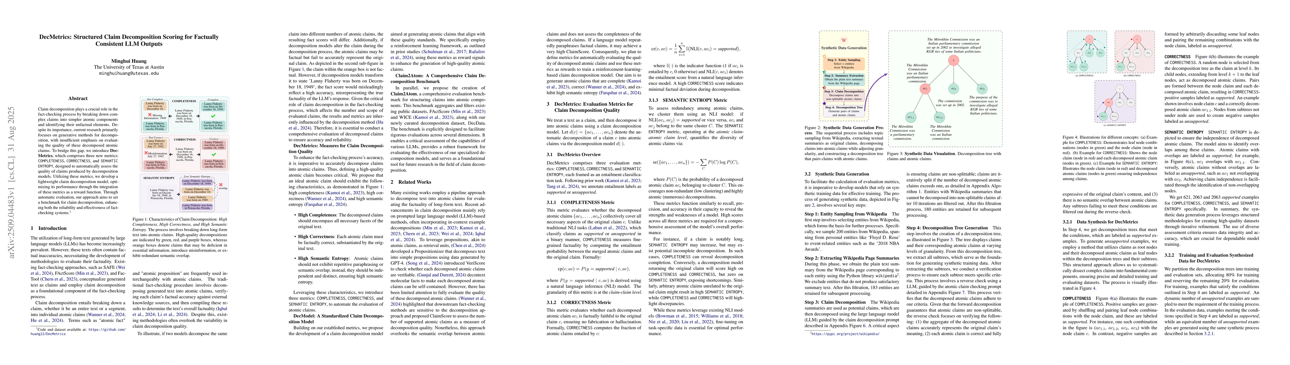 Claim decomposition plays a crucial role in the fact-checking process by breaking down complex claims into simpler atomic components and identifying their unfactual elements. Despite its importance, current research primarily focuses on generative methods for decomposition, with insufficient emphasis on evaluating the quality of these decomposed atomic claims. To bridge this gap, we introduce \textbf{DecMetrics}, which comprises three new metrics: \texttt{COMPLETENESS}, \texttt{CORRECTNESS}, and \texttt{SEMANTIC ENTROPY}, designed to automatically assess the quality of claims produced by decomposition models. Utilizing these metrics, we develop a lightweight claim decomposition model, optimizing its performance through the integration of these metrics as a reward function. Through automatic evaluation, our approach aims to set a benchmark for claim decomposition, enhancing both the reliability and effectiveness of fact-checking systems.