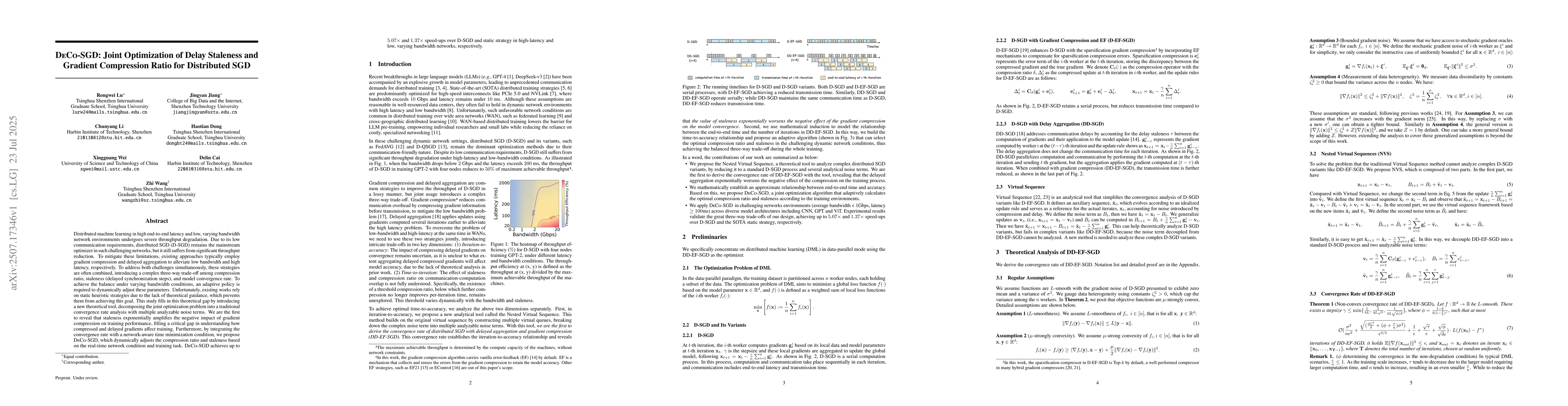 Distributed machine learning in high end-to-end latency and low, varying bandwidth network environments undergoes severe throughput degradation. Due to its low communication requirements, distributed SGD (D-SGD) remains the mainstream optimizer in such challenging networks, but it still suffers from significant throughput reduction. To mitigate these limitations, existing approaches typically employ gradient compression and delayed aggregation to alleviate low bandwidth and high latency, respectively. To address both challenges simultaneously, these strategies are often combined, introducing a complex three-way trade-off among compression ratio, staleness (delayed synchronization steps), and model convergence rate. To achieve the balance under varying bandwidth conditions, an adaptive policy is required to dynamically adjust these parameters. Unfortunately, existing works rely on static heuristic strategies due to the lack of theoretical guidance, which prevents them from achieving this goal. This study fills in this theoretical gap by introducing a new theoretical tool, decomposing the joint optimization problem into a traditional convergence rate analysis with multiple analyzable noise terms. We are the first to reveal that staleness exponentially amplifies the negative impact of gradient compression on training performance, filling a critical gap in understanding how compressed and delayed gradients affect training. Furthermore, by integrating the convergence rate with a network-aware time minimization condition, we propose DeCo-SGD, which dynamically adjusts the compression ratio and staleness based on the real-time network condition and training task. DeCo-SGD achieves up to 5.07 and 1.37 speed-ups over D-SGD and static strategy in high-latency and low, varying bandwidth networks, respectively.