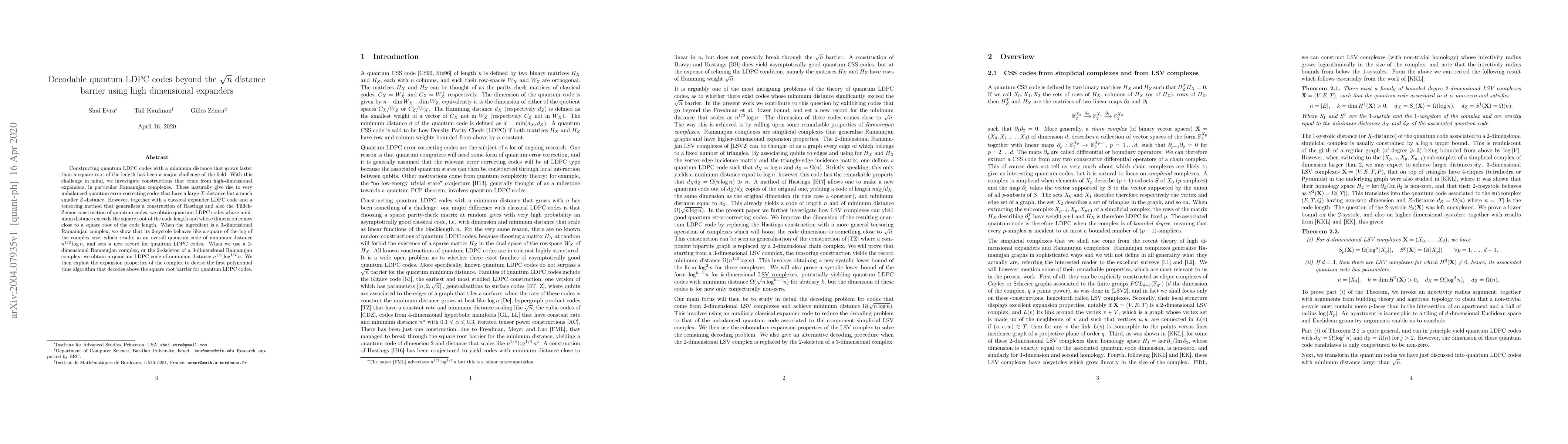 Constructing quantum LDPC codes with a minimum distance that grows faster than a square root of the length has been a major challenge of the field. With this challenge in mind, we investigate constructions that come from high-dimensional expanders, in particular Ramanujan complexes. These naturally give rise to very unbalanced quantum error correcting codes that have a large $X$-distance but a much smaller $Z$-distance. However, together with a classical expander LDPC code and a tensoring method that generalises a construction of Hastings and also the Tillich-Zemor construction of quantum codes, we obtain quantum LDPC codes whose minimum distance exceeds the square root of the code length and whose dimension comes close to a square root of the code length. When the ingredient is a 3-dimensional Ramanujan complex, we show that its 2-systole behaves like a square of the log of the complex size, which results in an overall quantum code of minimum distance $n^{1/2}\log n$, and sets a new record for quantum LDPC codes. When we use a 2-dimensional Ramanujan complex, or the 2-skeleton of a 3-dimensional Ramanujan complex, we obtain a quantum LDPC code of minimum distance $n^{1/2}\log^{1/2}n$. We then exploit the expansion properties of the complex to devise the first polynomial time algorithm that decodes above the square root barrier for quantum LDPC codes.