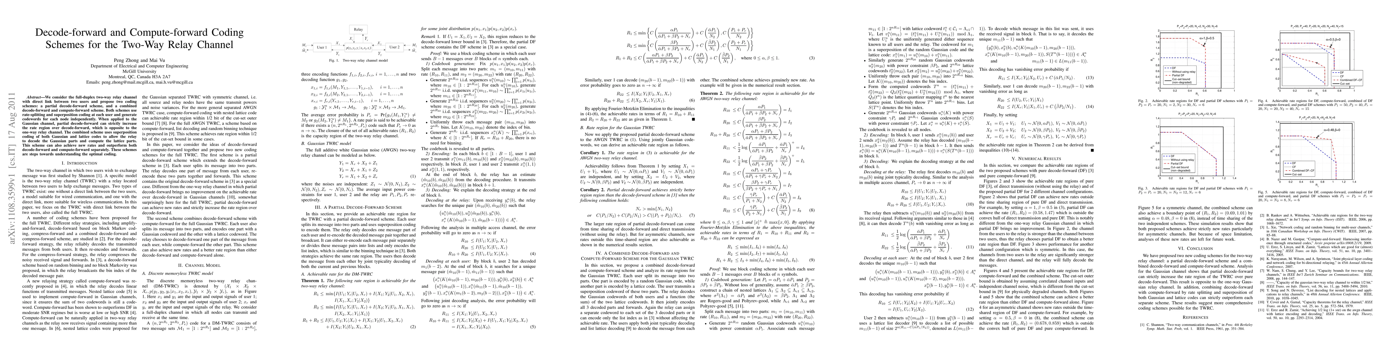 We consider the full-duplex two-way relay channel with direct link between two users and propose two coding schemes: a partial decode-forward scheme, and a combined decode-forward and compute-forward scheme. Both schemes use rate-splitting and superposition coding at each user and generate codewords for each node independently. When applied to the Gaussian channel, partial decode-forward can strictly increase the rate region over decode-forward, which is opposite to the one-way relay channel. The combined scheme uses superposition coding of both Gaussian and lattice codes to allow the relay to decode the Gaussian parts and compute the lattice parts. This scheme can also achieve new rates and outperform both decode-forward and compute-forward separately. These schemes are steps towards understanding the optimal coding.