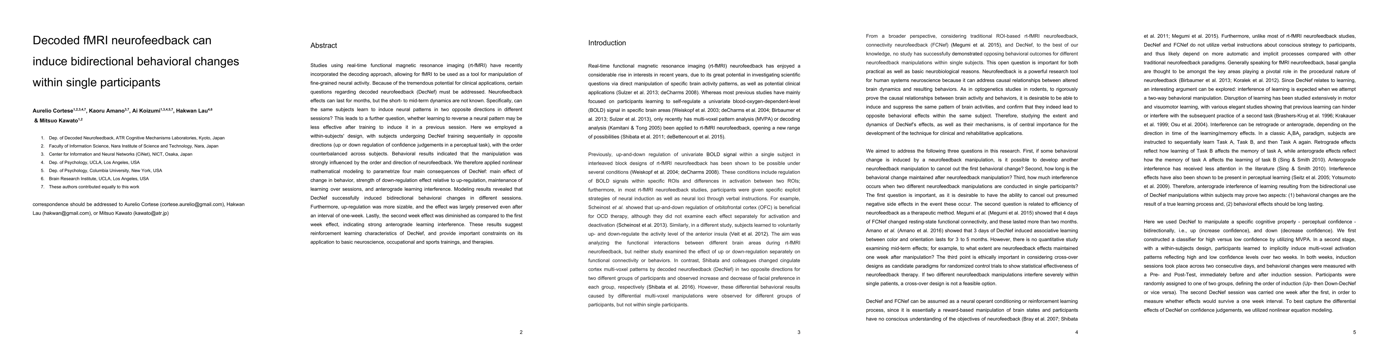 Decoded fMRI neurofeedback can induce bidirectional behavioral changes in individuals, with up-regulation being more effective and effects lasting even after a week-long interval. The training process shows characteristics of reinforcement learning and provides insights for applications in neuroscience, sports, and therapies.