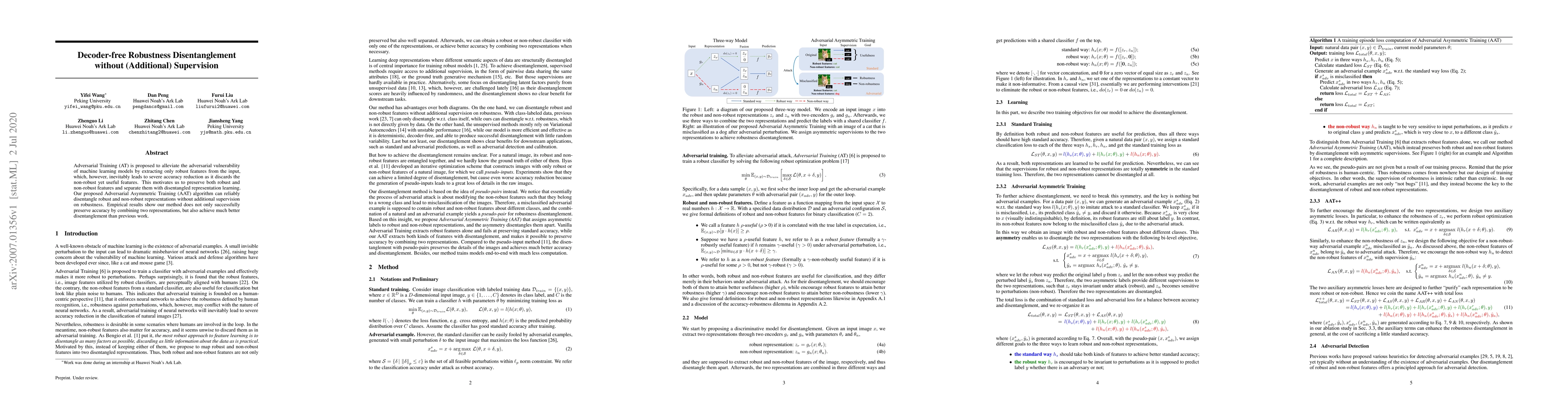 Adversarial Training (AT) is proposed to alleviate the adversarial vulnerability of machine learning models by extracting only robust features from the input, which, however, inevitably leads to severe accuracy reduction as it discards the non-robust yet useful features. This motivates us to preserve both robust and non-robust features and separate them with disentangled representation learning. Our proposed Adversarial Asymmetric Training (AAT) algorithm can reliably disentangle robust and non-robust representations without additional supervision on robustness. Empirical results show our method does not only successfully preserve accuracy by combining two representations, but also achieve much better disentanglement than previous work.
