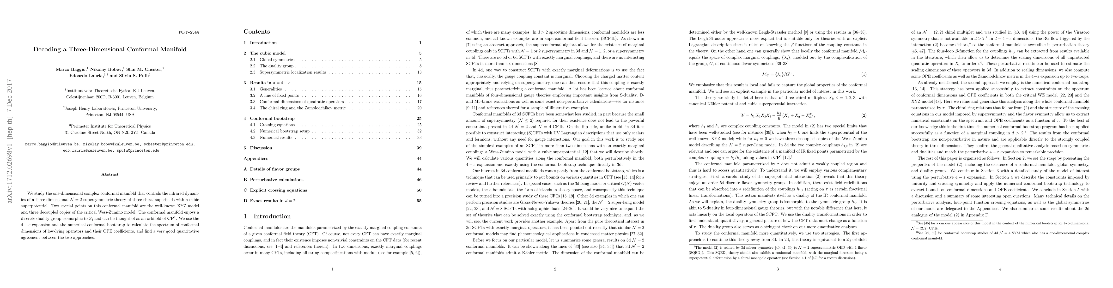 We study the one-dimensional complex conformal manifold that controls the infrared dynamics of a three-dimensional $\mathcal{N}=2$ supersymmetric theory of three chiral superfields with a cubic superpotential. Two special points on this conformal manifold are the well-known XYZ model and three decoupled copies of the critical Wess-Zumino model. The conformal manifold enjoys a discrete duality group isomorphic to $S_4$ and can be thought of as an orbifold of $\mathbf{CP}^1$. We use the $4-\varepsilon$ expansion and the numerical conformal bootstrap to calculate the spectrum of conformal dimensions of low-lying operators and their OPE coefficients, and find a very good quantitative agreement between the two approaches.