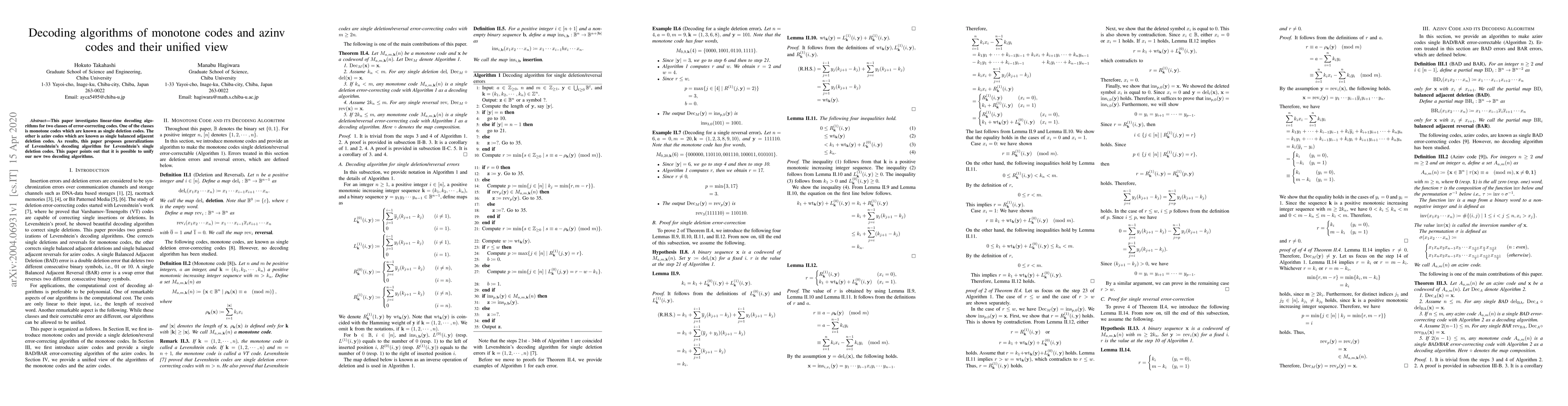This paper investigates linear-time decoding algorithms for two classes of error-correcting codes. One of the classes is monotone codes which are known as single deletion codes. The other is azinv codes which are known as single balanced adjacent deletion codes. As results, this paper proposes generalizations of Levenshtein's decoding algorithm for Levenshtein's single deletion codes. This paper points out that it is possible to unify our new two decoding algorithms.