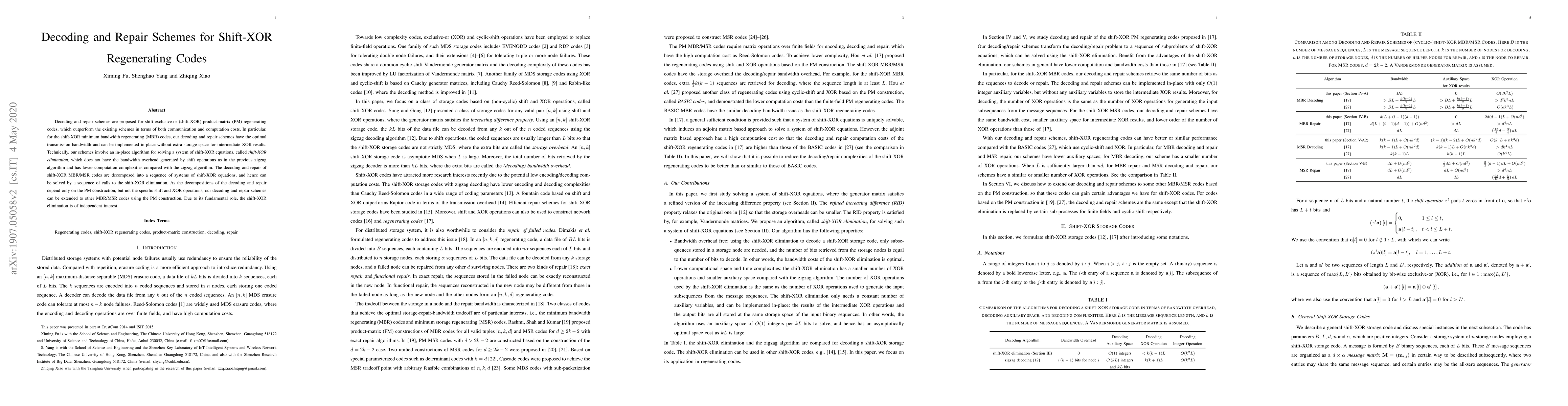 Decoding and repair schemes are proposed for shift-exclusive-or (shift-XOR) product-matrix (PM) regenerating codes, which outperform the existing schemes in terms of both communication and computation costs. In particular, for the shift-XOR minimum bandwidth regenerating (MBR) codes, our decoding and repair schemes have the optimal transmission bandwidth and can be implemented in-place without extra storage space for intermediate XOR results. Technically, our schemes involve an in-place algorithm for solving a system of shift-XOR equations, called \emph{shift-XOR elimination}, which does not have the bandwidth overhead generated by shift operations as in the previous zigzag algorithm and has lower computation complexities compared with the zigzag algorithm. The decoding and repair of shift-XOR MBR/MSR codes are decomposed into a sequence of systems of shift-XOR equations, and hence can be solved by a sequence of calls to the shift-XOR elimination. As the decompositions of the decoding and repair depend only on the PM construction, but not the specific shift and XOR operations, our decoding and repair schemes can be extended to other MBR/MSR codes using the PM construction. Due to its fundamental role, the shift-XOR elimination is of independent interest.