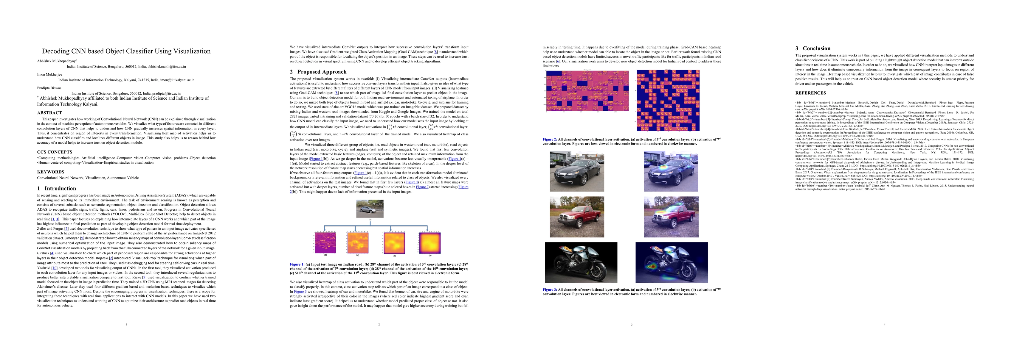 This paper investigates how working of Convolutional Neural Network (CNN) can be explained through visualization in the context of machine perception of autonomous vehicles. We visualize what type of features are extracted in different convolution layers of CNN that helps to understand how CNN gradually increases spatial information in every layer. Thus, it concentrates on region of interests in every transformation. Visualizing heat map of activation helps us to understand how CNN classifies and localizes different objects in image. This study also helps us to reason behind low accuracy of a model helps to increase trust on object detection module.