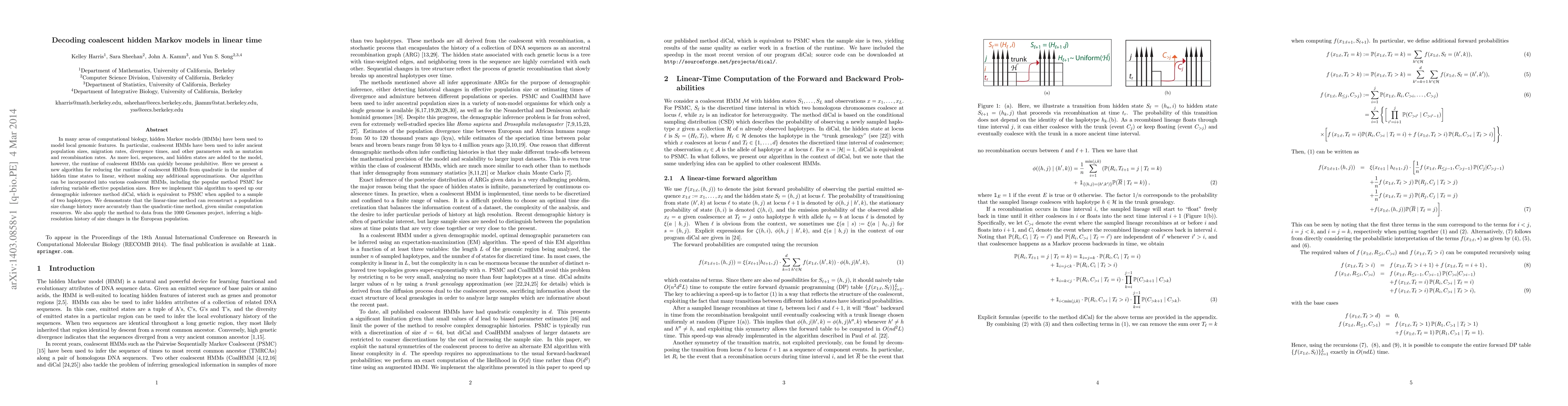 This paper introduces a new linear-time algorithm to decode coalescent hidden Markov models, significantly reducing runtime from quadratic to linear complexity without approximations. The method improves the accuracy of demographic inference compared to traditional quadratic-time methods, as demonstrated through applications to the 1000 Genomes project data.