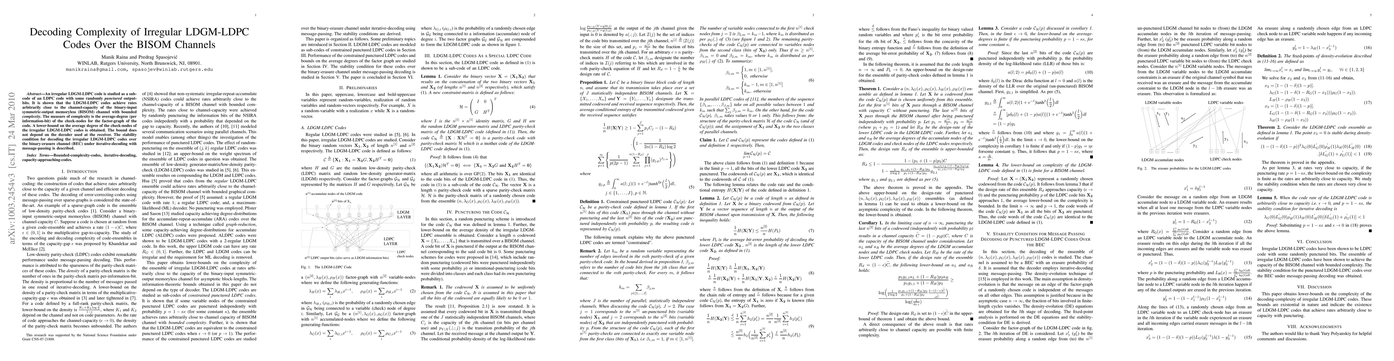 This paper investigates irregular LDGM-LDPC codes, demonstrating their capacity to approach the BISOM channel's capacity with bounded complexity. A lower-bound on the average degree of check-nodes is derived, independent of the decoder, and stability conditions for decoding over the BEC are established.