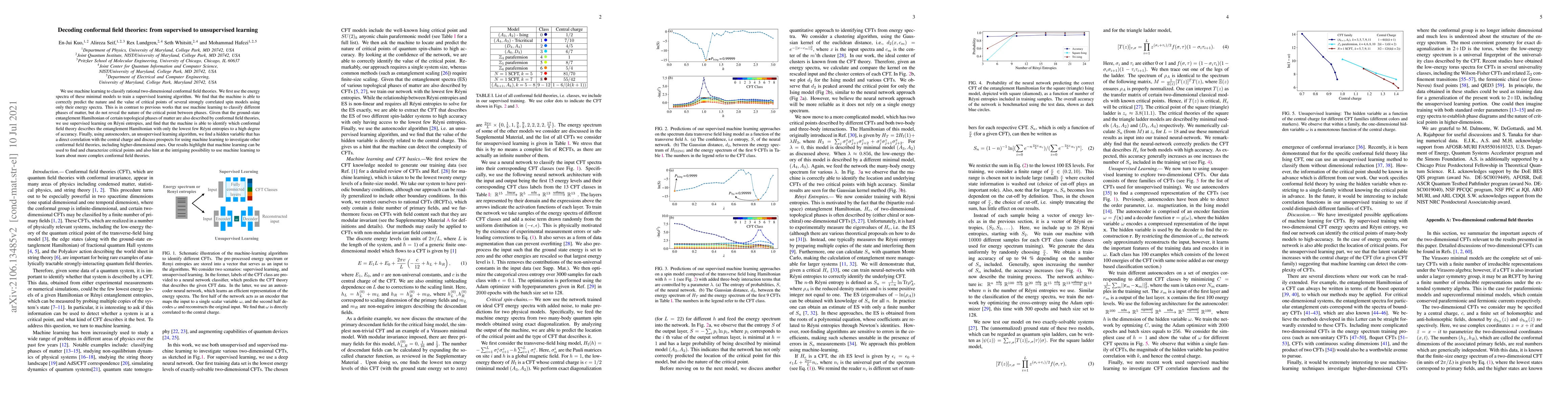 We use machine learning to classify rational two-dimensional conformal field theories. We first use the energy spectra of these minimal models to train a supervised learning algorithm. We find that the machine is able to correctly predict the nature and the value of critical points of several strongly correlated spin models using only their energy spectra. This is in contrast to previous works that use machine learning to classify different phases of matter, but do not reveal the nature of the critical point between phases. Given that the ground-state entanglement Hamiltonian of certain topological phases of matter is also described by conformal field theories, we use supervised learning on R\'{e}yni entropies and find that the machine is able to identify which conformal field theory describes the entanglement Hamiltonian with only the lowest few R\'{e}yni entropies to a high degree of accuracy. Finally, using autoencoders, an unsupervised learning algorithm, we find a hidden variable that has a direct correlation with the central charge and discuss prospects for using machine learning to investigate other conformal field theories, including higher-dimensional ones. Our results highlight that machine learning can be used to find and characterize critical points and also hint at the intriguing possibility to use machine learning to learn about more complex conformal field theories.