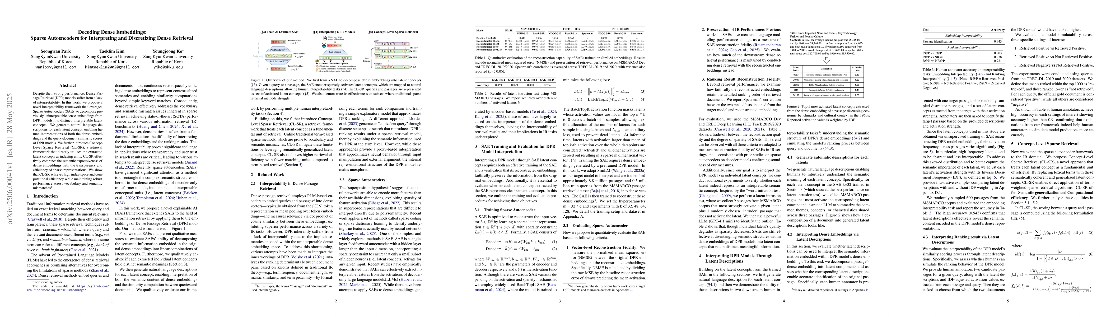 Researchers developed a method to make Dense Passage Retrieval models more interpretable by decomposing dense embeddings into distinct latent concepts using Sparse Autoencoders. This allows for human interpretation of model outputs.