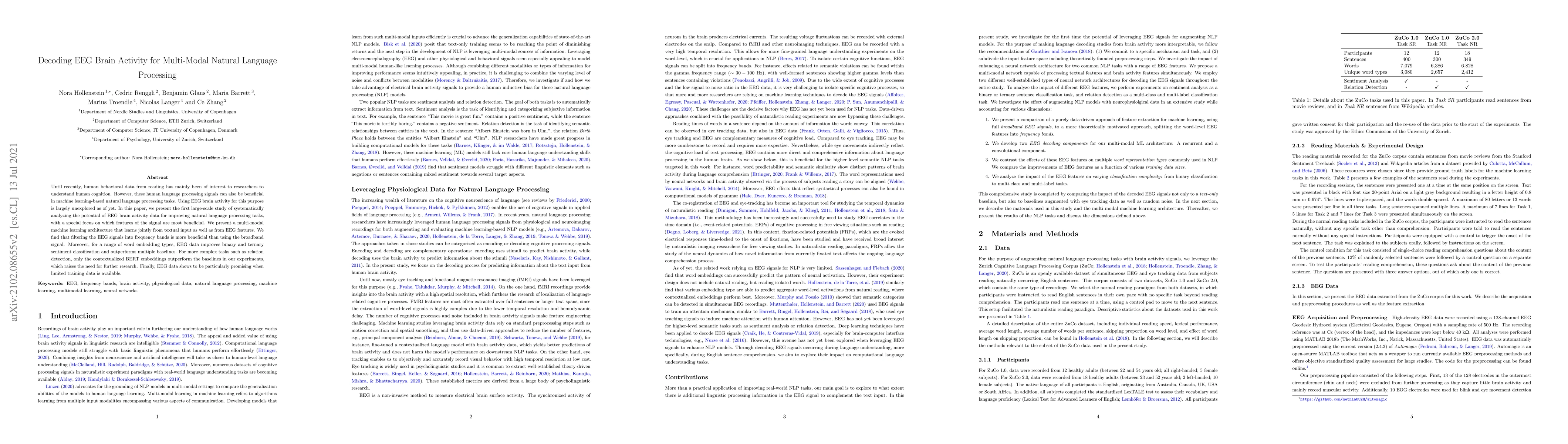 The paper presents a large-scale study on using EEG brain activity data for improving natural language processing tasks, focusing on which signal features are most beneficial. A multi-modal machine learning architecture is developed to learn jointly from textual input and EEG features.