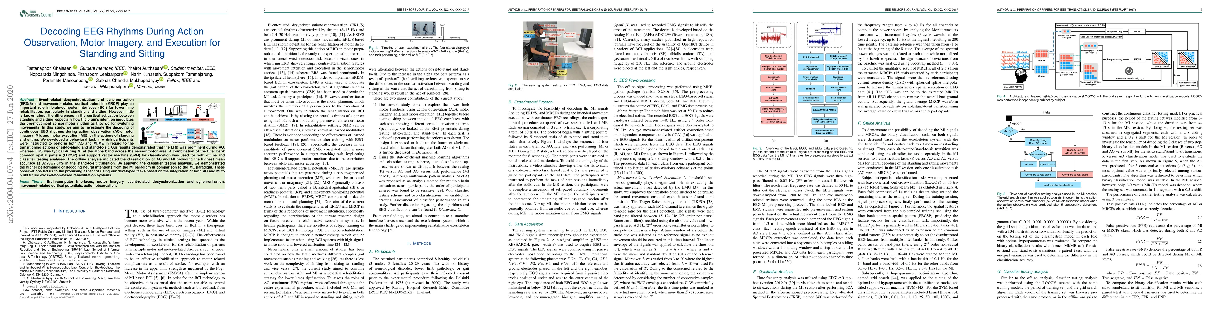 This study investigates EEG rhythms during action observation, motor imagery, and execution for standing and sitting, revealing distinct ERD during AO and ERS during MI in the alpha band. The developed task achieved 82.73% accuracy in classifying AO and MI, suggesting potential for exoskeleton-based rehabilitation systems.