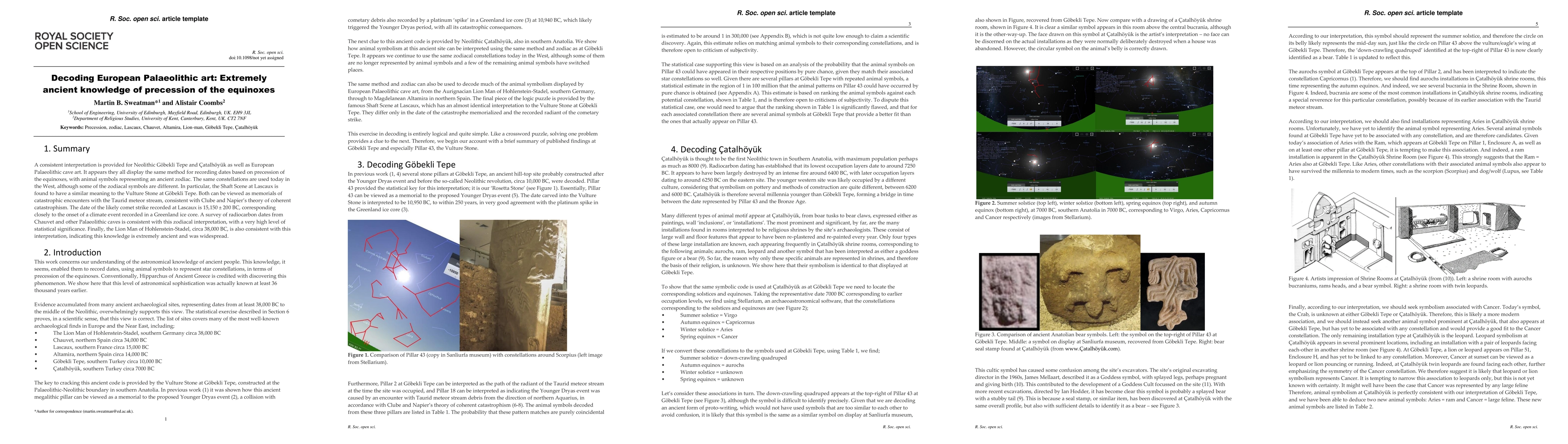 This paper decodes European Palaeolithic art as a record of ancient knowledge of the precession of the equinoxes, using animal symbols as an ancient zodiac. The findings suggest a consistent dating method across Neolithic and Palaeolithic sites, including Lascaux and Gobekli Tepe, indicating a shared memory of catastrophic meteor events.