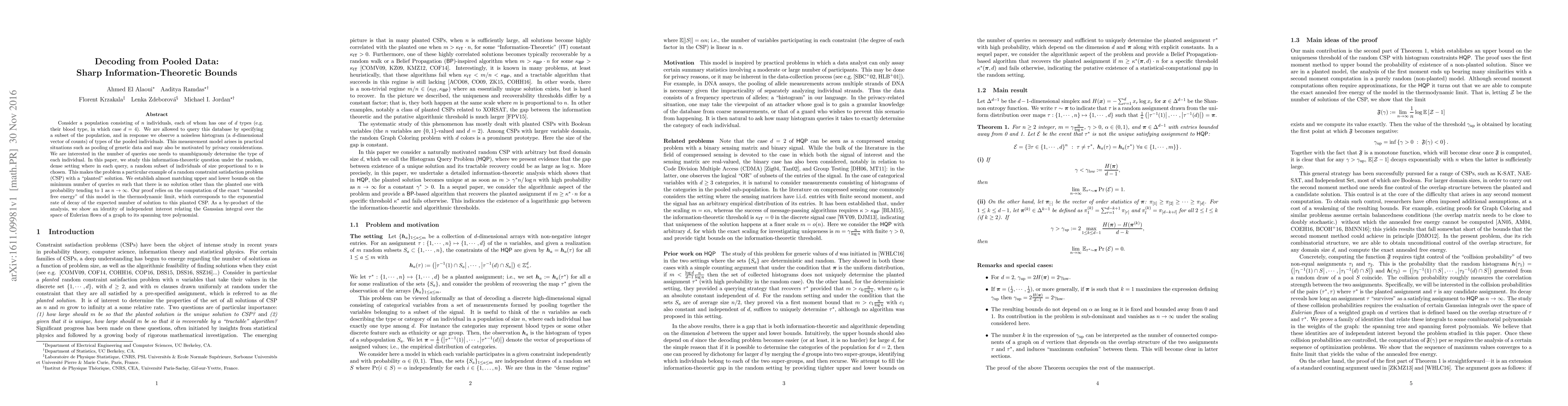 Consider a population consisting of n individuals, each of whom has one of d types (e.g. their blood type, in which case d=4). We are allowed to query this database by specifying a subset of the population, and in response we observe a noiseless histogram (a d-dimensional vector of counts) of types of the pooled individuals. This measurement model arises in practical situations such as pooling of genetic data and may also be motivated by privacy considerations. We are interested in the number of queries one needs to unambiguously determine the type of each individual. In this paper, we study this information-theoretic question under the random, dense setting where in each query, a random subset of individuals of size proportional to n is chosen. This makes the problem a particular example of a random constraint satisfaction problem (CSP) with a "planted" solution. We establish almost matching upper and lower bounds on the minimum number of queries m such that there is no solution other than the planted one with probability tending to 1 as n tends to infinity. Our proof relies on the computation of the exact "annealed free energy" of this model in the thermodynamic limit, which corresponds to the exponential rate of decay of the expected number of solution to this planted CSP. As a by-product of the analysis, we show an identity of independent interest relating the Gaussian integral over the space of Eulerian flows of a graph to its spanning tree polynomial.