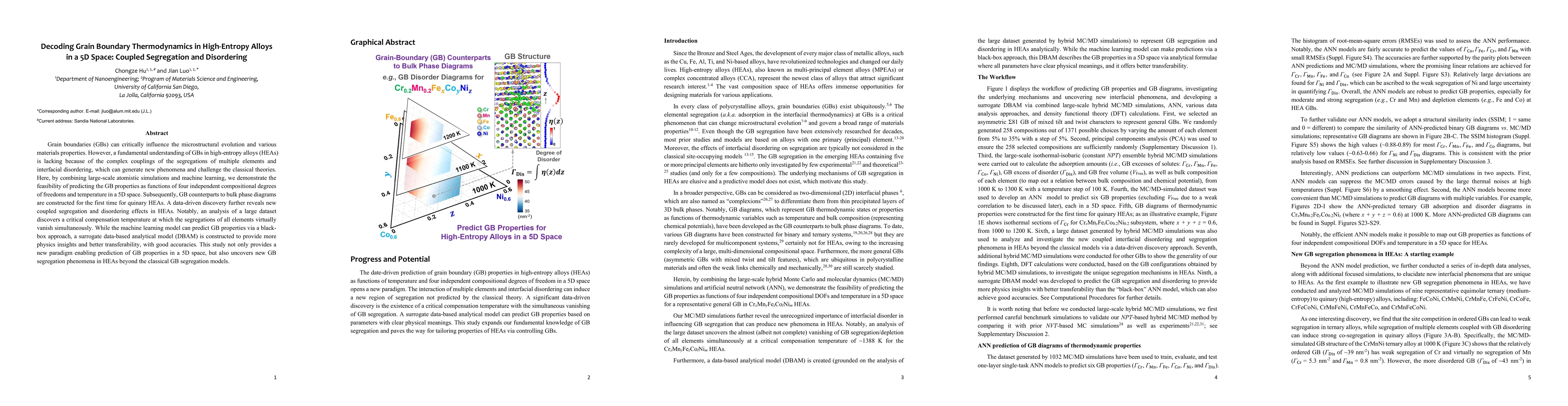 Grain boundaries (GBs) can critically influence the microstructural evolution and various materials properties. However, a fundamental understanding of GBs in high-entropy alloys (HEAs) is lacking because of the complex couplings of the segregations of multiple elements and interfacial disordering, which can generate new phenomena and challenge the classical theories. Here, by combining large-scale atomistic simulations and machine learning, we demonstrate the feasibility of predicting the GB properties as functions of four independent compositional degrees of freedoms and temperature in a 5D space. Subsequently, GB counterparts to bulk phase diagrams are constructed for the first time for quinary HEAs. A data-driven discovery further reveals new coupled segregation and disordering effects in HEAs. Notably, an analysis of a large dataset discovers a critical compensation temperature at which the segregations of all elements virtually vanish simultaneously. While the machine learning model can predict GB properties via a black-box approach, a surrogate data-based analytical model (DBAM) is constructed to provide more physics insights and better transferability, with good accuracies. This study not only provides a new paradigm enabling prediction of GB properties in a 5D space, but also uncovers new GB segregation phenomena in HEAs beyond the classical GB segregation models.