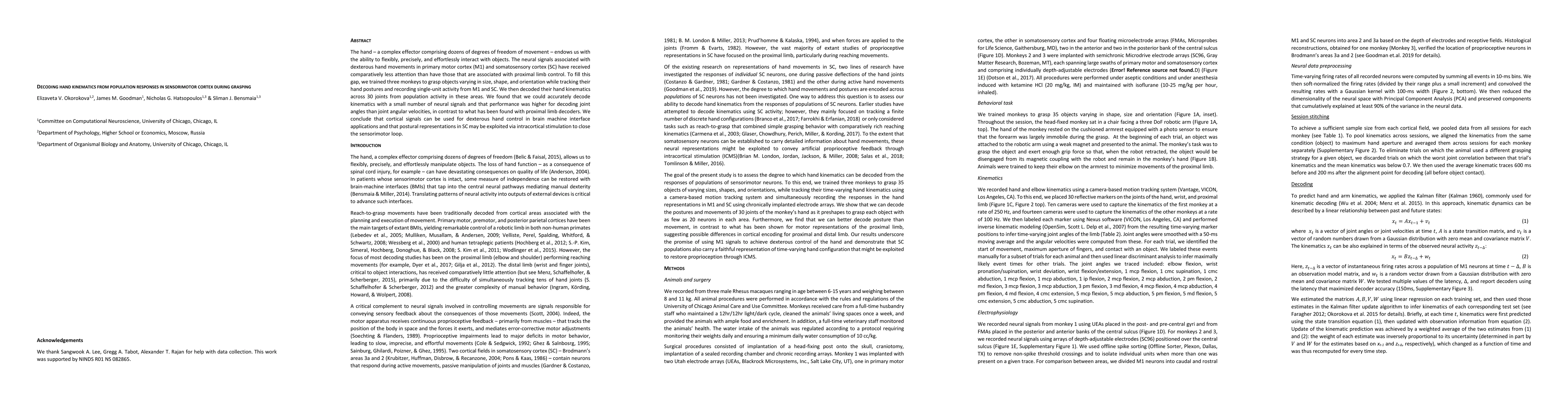 This study demonstrates that neural signals from the primary motor cortex (M1) and somatosensory cortex (SC) can accurately decode the kinematics of a monkey's hand during grasping tasks. It reveals that cortical signals are more effective at decoding joint angles than velocities, indicating potential for advanced brain-machine interface applications.
