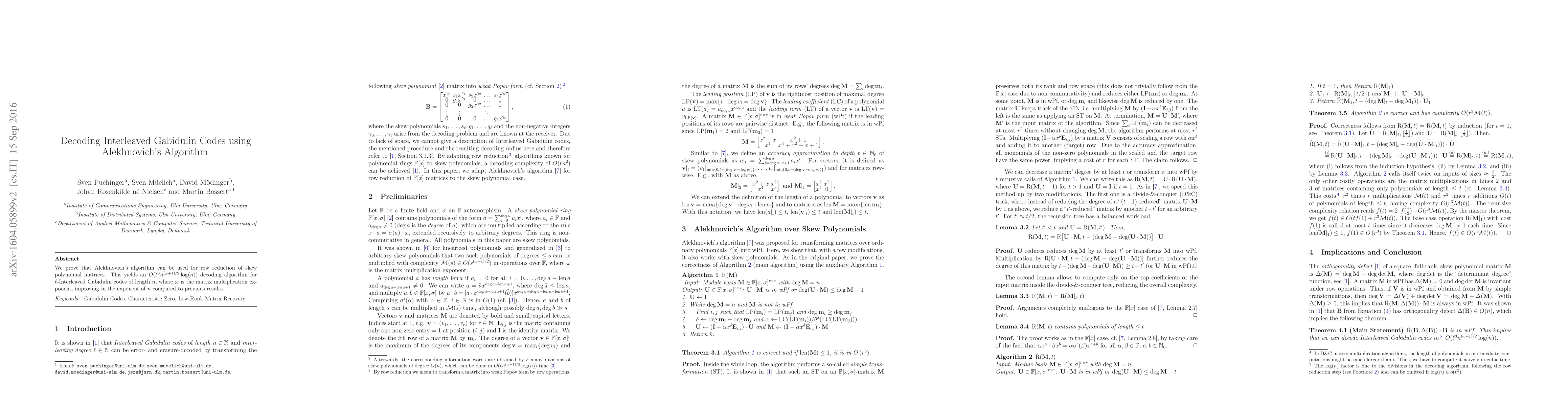 We prove that Alekhnovich's algorithm can be used for row reduction of skew polynomial matrices. This yields an $O(\ell^3 n^{(\omega+1)/2} \log(n))$ decoding algorithm for $\ell$-Interleaved Gabidulin codes of length $n$, where $\omega$ is the matrix multiplication exponent, improving in the exponent of $n$ compared to previous results.