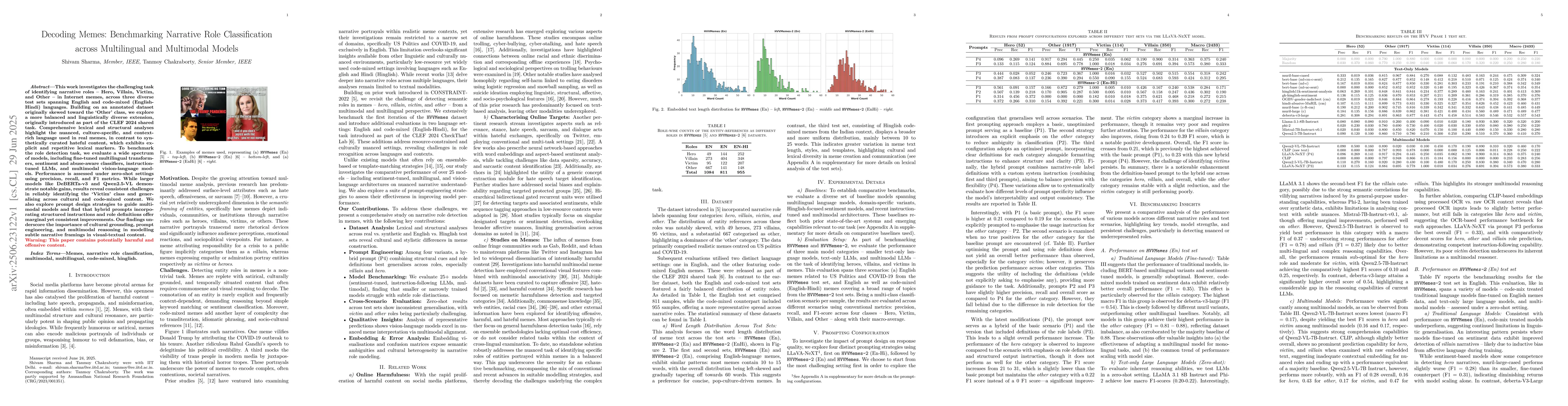 This work investigates the challenging task of identifying narrative roles - Hero, Villain, Victim, and Other - in Internet memes, across three diverse test sets spanning English and code-mixed (English-Hindi) languages. Building on an annotated dataset originally skewed toward the 'Other' class, we explore a more balanced and linguistically diverse extension, originally introduced as part of the CLEF 2024 shared task. Comprehensive lexical and structural analyses highlight the nuanced, culture-specific, and context-rich language used in real memes, in contrast to synthetically curated hateful content, which exhibits explicit and repetitive lexical markers. To benchmark the role detection task, we evaluate a wide spectrum of models, including fine-tuned multilingual transformers, sentiment and abuse-aware classifiers, instruction-tuned LLMs, and multimodal vision-language models. Performance is assessed under zero-shot settings using precision, recall, and F1 metrics. While larger models like DeBERTa-v3 and Qwen2.5-VL demonstrate notable gains, results reveal consistent challenges in reliably identifying the 'Victim' class and generalising across cultural and code-mixed content. We also explore prompt design strategies to guide multimodal models and find that hybrid prompts incorporating structured instructions and role definitions offer marginal yet consistent improvements. Our findings underscore the importance of cultural grounding, prompt engineering, and multimodal reasoning in modelling subtle narrative framings in visual-textual content.