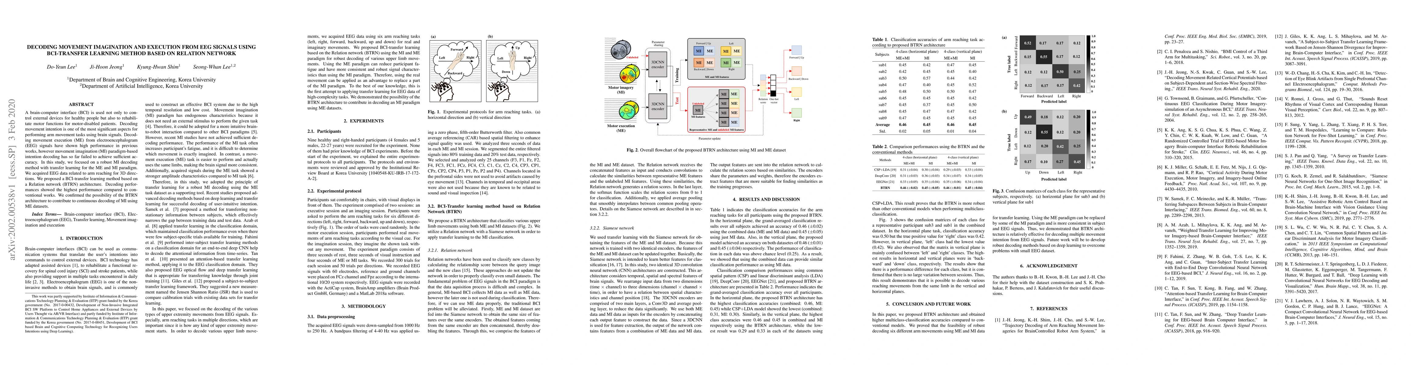The study acquired EEG data from nine healthy participants performing six arm reaching tasks for real and imaginary movements. Data preprocessing included downsampling, bandpass filtering, and common averaging referencing. A BCI-transfer learning method based on a Relation Network (BTRN) architecture was proposed, utilizing a Siamese network for feature extraction from both motor execution (ME) and motor imagery (MI) datasets.