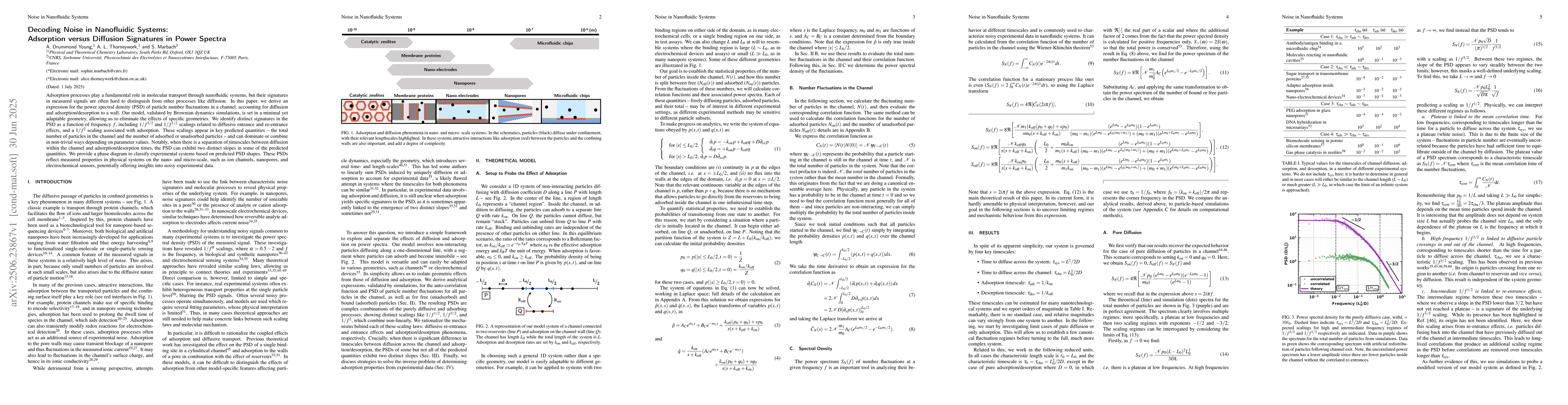 This research derives a power spectral density model for particle fluctuations in nanofluidic systems, considering both diffusion and adsorption/desorption. It identifies distinct frequency-dependent signatures, including $1/f^{3/2}$, $1/f^{1/2}$, and $1/f^2$ scalings, linked to diffusive and adsorption processes. The model, validated by simulations, offers insights into distinguishing adsorption from diffusion in noisy experimental data of nano- and microscale systems like ion channels and electrochemical sensors.