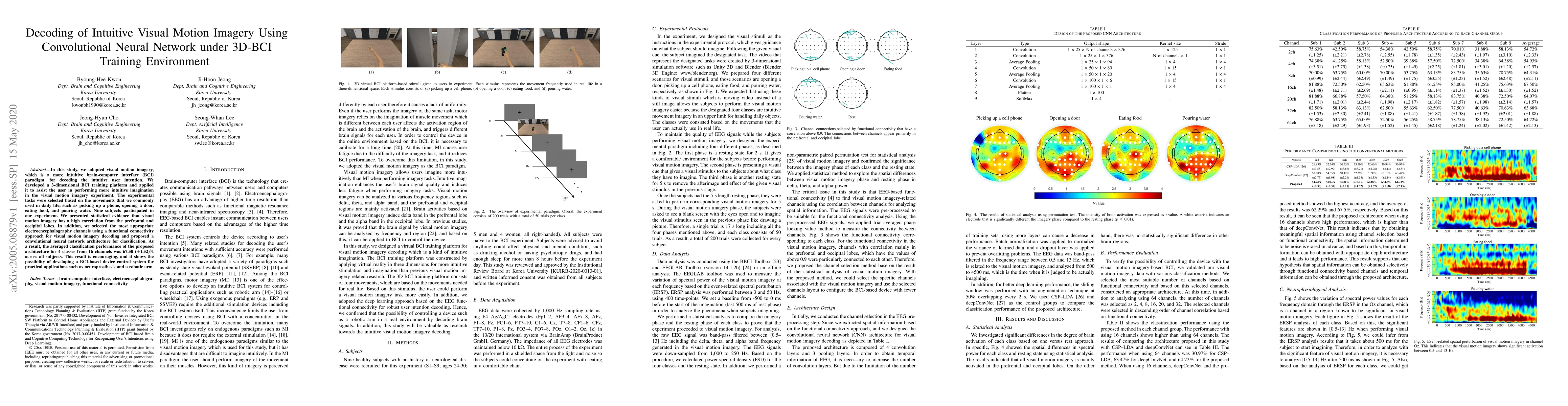 In this study, we adopted visual motion imagery, which is a more intuitive brain-computer interface (BCI) paradigm, for decoding the intuitive user intention. We developed a 3-dimensional BCI training platform and applied it to assist the user in performing more intuitive imagination in the visual motion imagery experiment. The experimental tasks were selected based on the movements that we commonly used in daily life, such as picking up a phone, opening a door, eating food, and pouring water. Nine subjects participated in our experiment. We presented statistical evidence that visual motion imagery has a high correlation from the prefrontal and occipital lobes. In addition, we selected the most appropriate electroencephalography channels using a functional connectivity approach for visual motion imagery decoding and proposed a convolutional neural network architecture for classification. As a result, the averaged classification performance of the proposed architecture for 4 classes from 16 channels was 67.50 % across all subjects. This result is encouraging, and it shows the possibility of developing a BCI-based device control system for practical applications such as neuroprosthesis and a robotic arm.