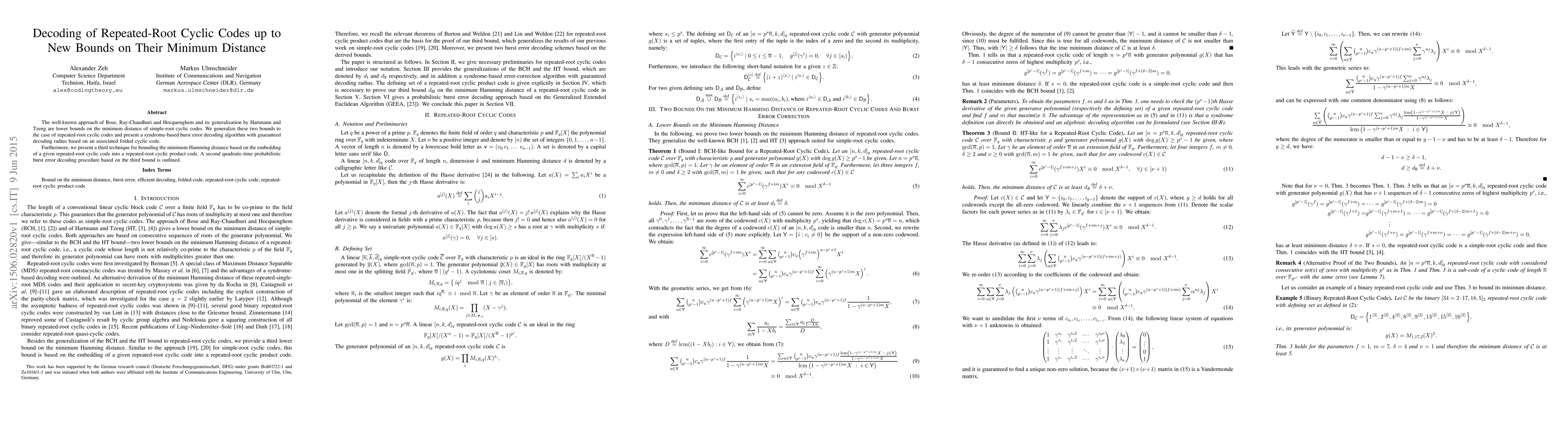 The well-known approach of Bose, Ray-Chaudhuri and Hocquenghem and its generalization by Hartmann and Tzeng are lower bounds on the minimum distance of simple-root cyclic codes. We generalize these two bounds to the case of repeated-root cyclic codes and present a syndrome-based burst error decoding algorithm with guaranteed decoding radius based on an associated folded cyclic code. Furthermore, we present a third technique for bounding the minimum Hamming distance based on the embedding of a given repeated-root cyclic code into a repeated-root cyclic product code. A second quadratic-time probabilistic burst error decoding procedure based on the third bound is outlined. Index Terms Bound on the minimum distance, burst error, efficient decoding, folded code, repeated-root cyclic code, repeated-root cyclic product code