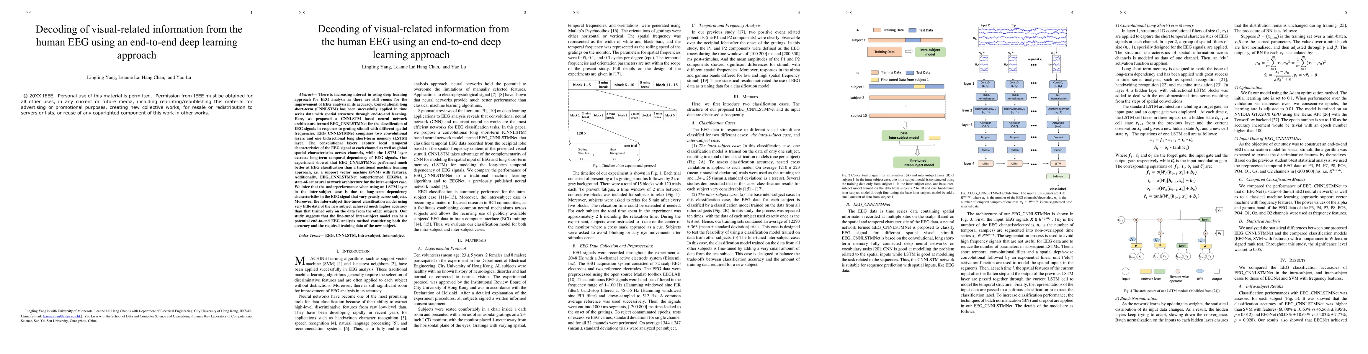 There is increasing interest in using deep learning approach for EEG analysis as there are still rooms for the improvement of EEG analysis in its accuracy. Convolutional long short-term (CNNLSTM) has been successfully applied in time series data with spatial structure through end-to-end learning. Here, we proposed a CNNLSTM based neural network architecture termed EEG_CNNLSTMNet for the classification of EEG signals in response to grating stimuli with different spatial frequencies. EEG_CNNLSTMNet comprises two convolutional layers and one bidirectional long short-term memory (LSTM) layer. The convolutional layers capture local temporal characteristics of the EEG signal at each channel as well as global spatial characteristics across channels, while the LSTM layer extracts long-term temporal dependency of EEG signals. Our experiment showed that EEG_CNNLSTMNet performed much better at EEG classification than a traditional machine learning approach, i.e. a support vector machine (SVM) with features. Additionally, EEG_CNNLSTMNet outperformed EEGNet, a state-of-art neural network architecture for the intra-subject case. We infer that the underperformance when using an LSTM layer in the inter-subject case is due to long-term dependency characteristics in the EEG signal that vary greatly across subjects. Moreover, the inter-subject fine-tuned classification model using very little data of the new subject achieved much higher accuracy than that trained only on the data from the other subjects. Our study suggests that the fine-tuned inter-subject model can be a potential end-to-end EEG analysis method considering both the accuracy and the required training data of the new subject.