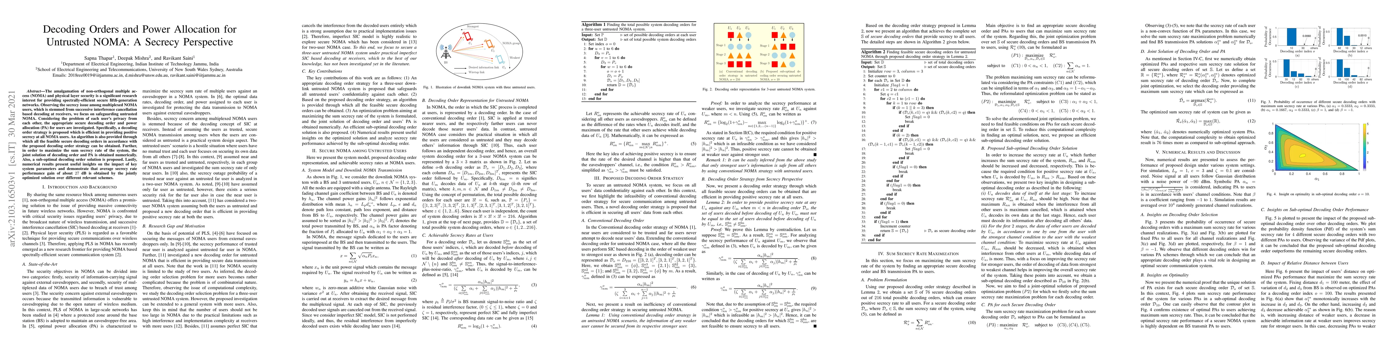 The paper presents a novel decoding order strategy and power allocation method for securing untrusted NOMA systems, along with an algorithm to obtain feasible secure decoding orders and a numerical approach to maximize the sum secrecy rate.