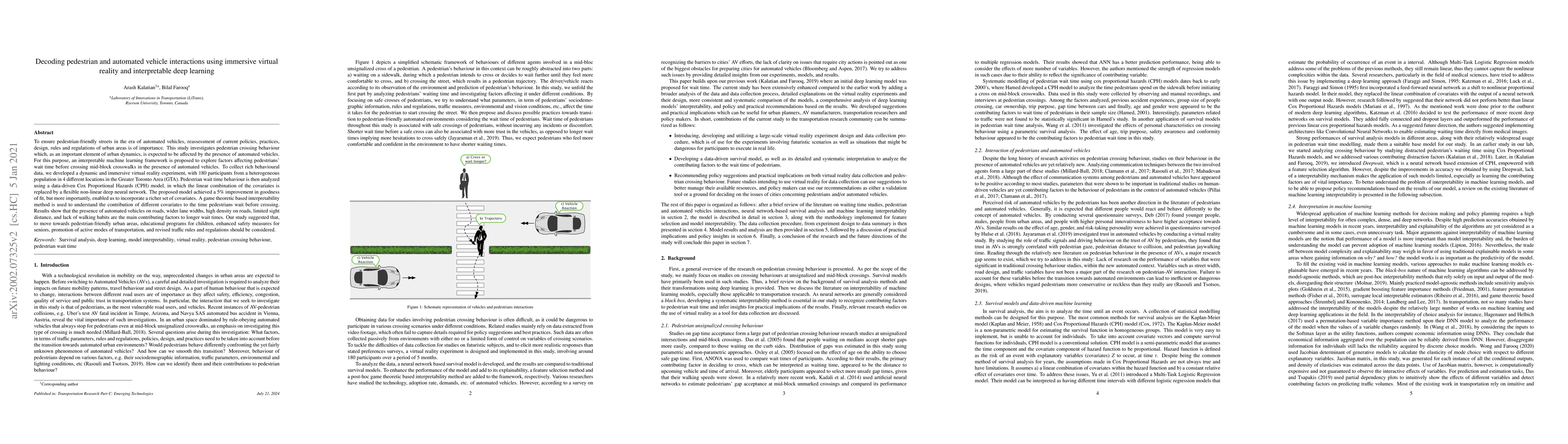This study uses immersive virtual reality and interpretable deep learning to analyze pedestrian crossing behavior in the presence of automated vehicles. The research found that factors like wider lanes, high road density, and lack of walking habits contribute to longer pedestrian wait times, suggesting the need for educational programs, safety measures, and revised traffic regulations for pedestrian-friendly urban design.