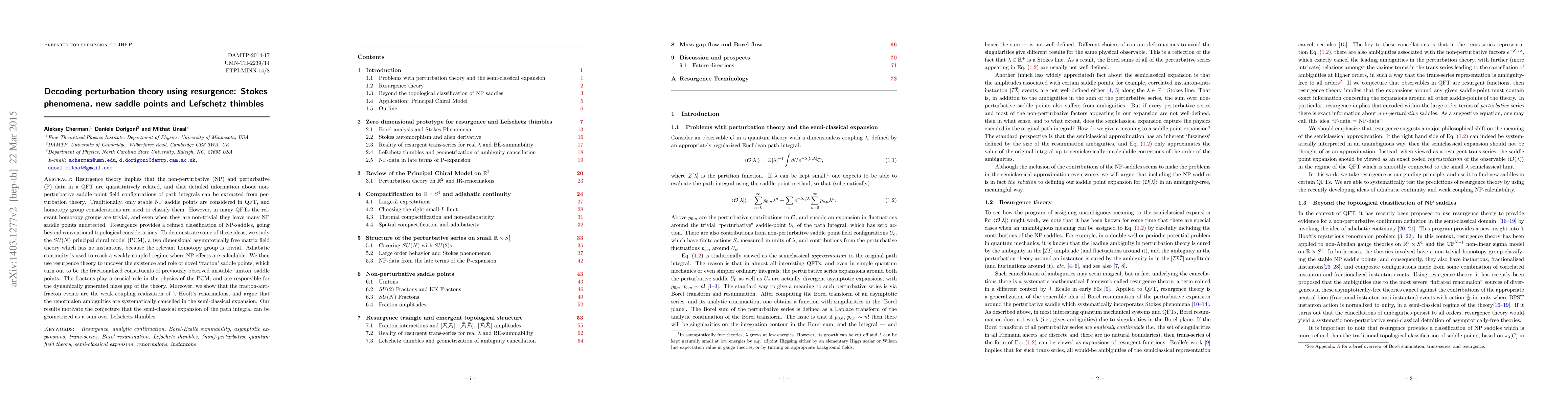 Resurgence theory implies that the non-perturbative (NP) and perturbative (P) data in a QFT are quantitatively related, and that detailed information about non-perturbative saddle point field configurations of path integrals can be extracted from perturbation theory. Traditionally, only stable NP saddle points are considered in QFT, and homotopy group considerations are used to classify them. However, in many QFTs the relevant homotopy groups are trivial, and even when they are non-trivial they leave many NP saddle points undetected. Resurgence provides a refined classification of NP-saddles, going beyond conventional topological considerations. To demonstrate some of these ideas, we study the $SU(N)$ principal chiral model (PCM), a two dimensional asymptotically free matrix field theory which has no instantons, because the relevant homotopy group is trivial. Adiabatic continuity is used to reach a weakly coupled regime where NP effects are calculable. We then use resurgence theory to uncover the existence and role of novel `fracton' saddle points, which turn out to be the fractionalized constituents of previously observed unstable `uniton' saddle points. The fractons play a crucial role in the physics of the PCM, and are responsible for the dynamically generated mass gap of the theory. Moreover, we show that the fracton-anti-fracton events are the weak coupling realization of 't Hooft's renormalons, and argue that the renormalon ambiguities are systematically cancelled in the semi-classical expansion. Our results motivate the conjecture that the semi-classical expansion of the path integral can be geometrized as a sum over Lefschetz thimbles.