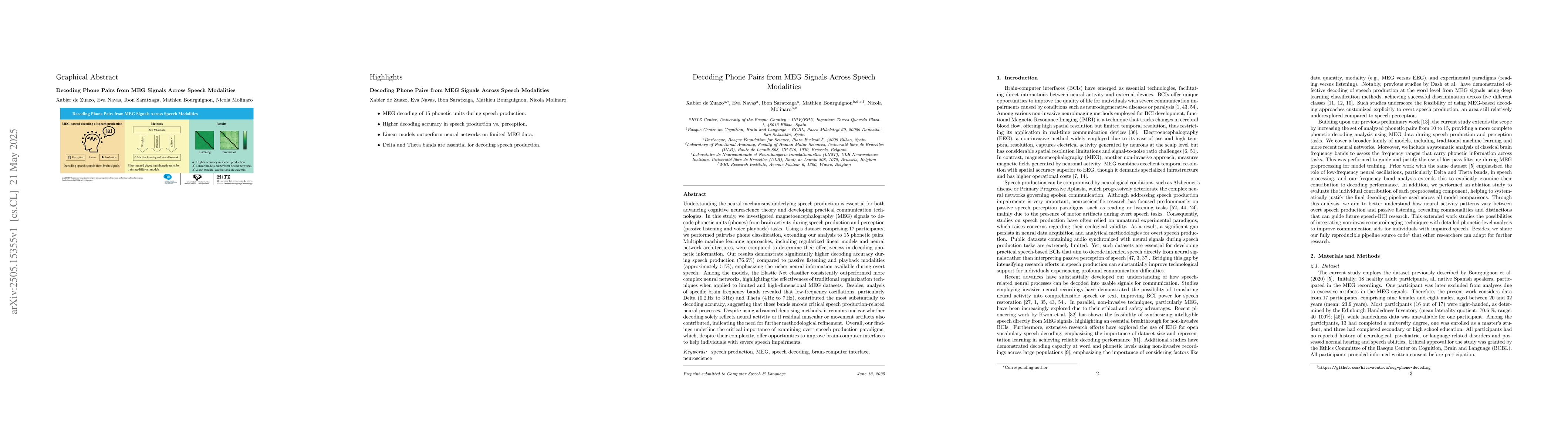 Researchers used MEG signals to decode phone pairs from brain activity during speech production and found higher accuracy compared to passive listening and playback modalities, with the Elastic Net classifier outperforming complex neural networks.