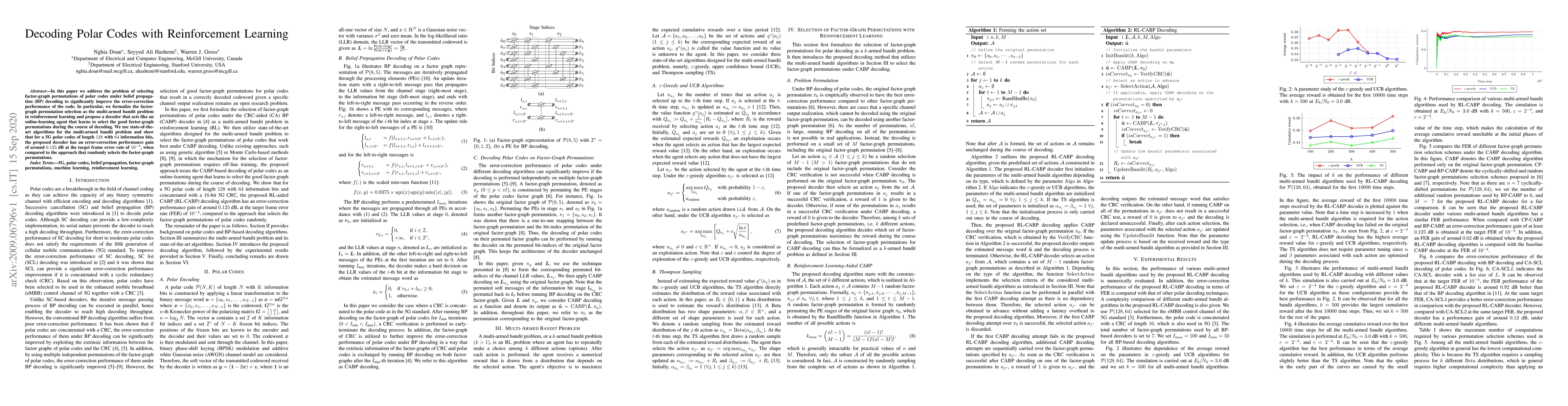Researchers developed a reinforcement learning-based decoder to optimize polar codes' factor-graph permutations for improved error correction performance, achieving a 0.125 dB gain over random permutation selection.
