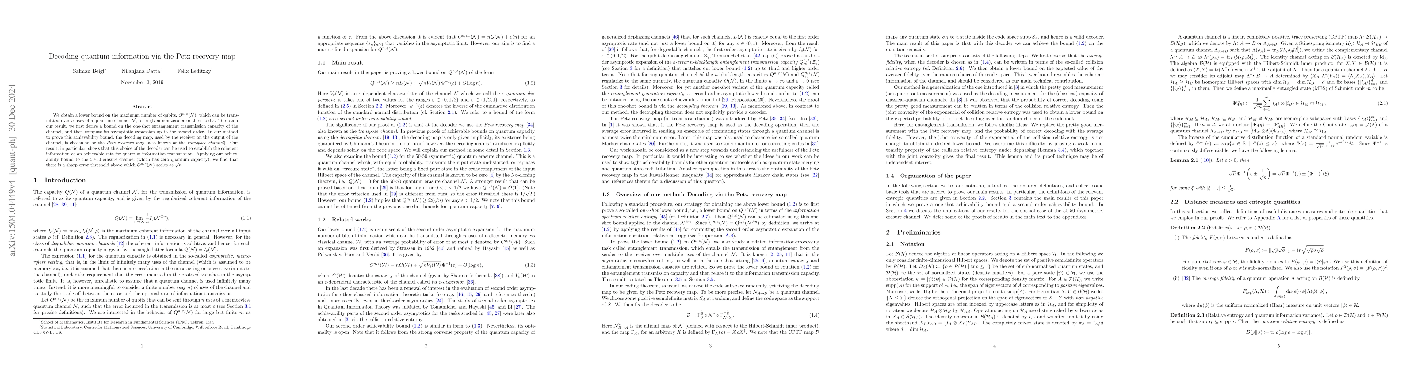 This paper establishes a lower bound on the maximum number of qubits that can be transmitted over a quantum channel with a given error threshold, using the Petz recovery map for decoding. The result shows that this decoding method can achieve coherent information as an achievable rate for quantum information transmission, with scaling behavior observed in the 50-50 erasure channel.