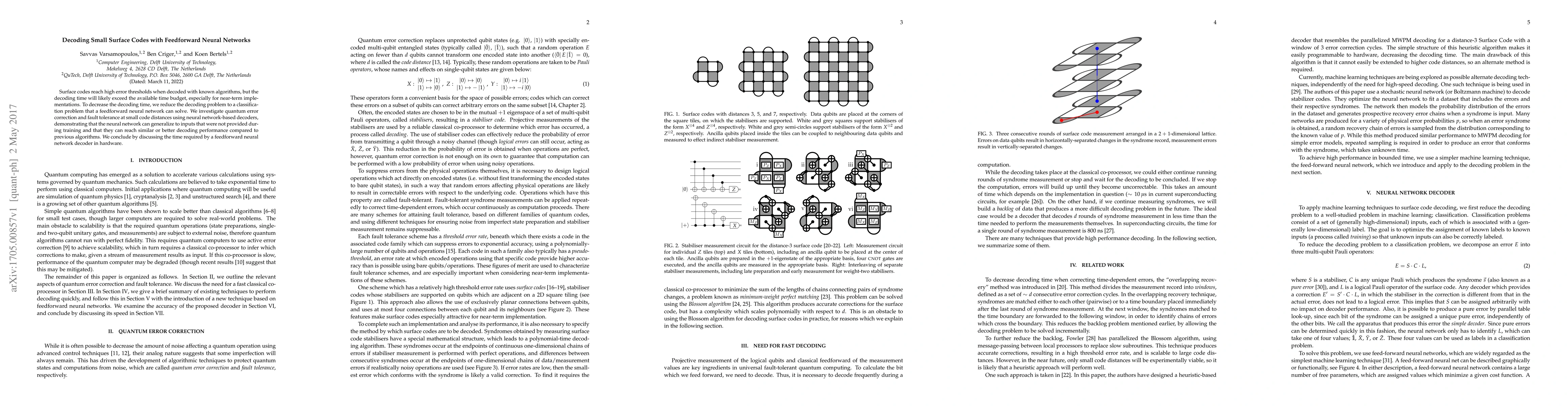 This paper explores using feedforward neural networks to decode small surface codes, transforming the decoding problem into a classification task to reduce time. The study finds that neural networks can generalize well and achieve comparable or superior performance to traditional algorithms, while also discussing the practical hardware time requirements.