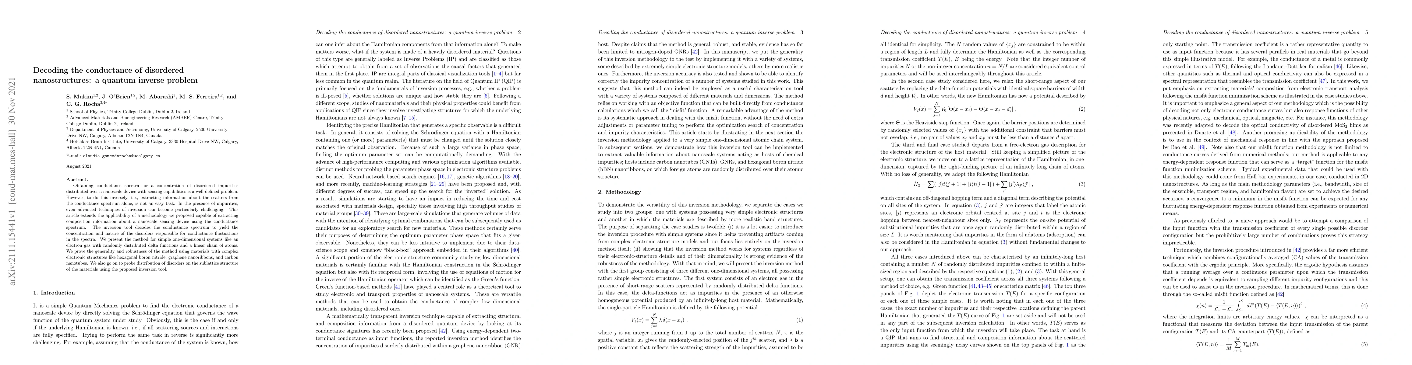 Obtaining conductance spectra for a concentration of disordered impurities distributed over a nanoscale device with sensing capabilities is a well-defined problem. However, to do this inversely, i.e., extracting information about the scatters from the conductance spectrum alone, is not an easy task. In the presence of impurities, even advanced techniques of inversion can become particularly challenging. This article extends the applicability of a methodology we proposed capable of extracting composition information about a nanoscale sensing device using the conductance spectrum. The inversion tool decodes the conductance spectrum to yield the concentration and nature of the disorders responsible for conductance fluctuations in the spectra. We present the method for simple one-dimensional systems like an electron gas with randomly distributed delta functions and a linear chain of atoms. We prove the generality and robustness of the method using materials with complex electronic structures like hexagonal boron nitride, graphene nanoribbons, and carbon nanotubes. We also go on to probe the distribution of disorders on the sublattice structure of the materials using the proposed inversion tool.