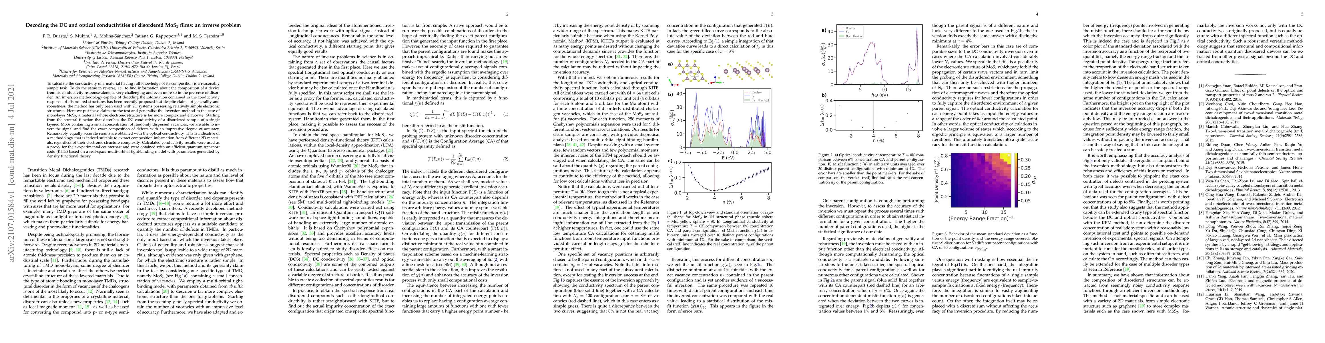 To calculate the conductivity of a material having full knowledge of its composition is a reasonably simple task. To do the same in reverse, i.e., to find information about the composition of a device from its conductivity response alone, is very challenging and even more so in the presence of disorder. An inversion methodology capable of decoding the information contained in the conductivity response of disordered structures has been recently proposed but despite claims of generality and robustness, the method has only been used with 2D systems possessing relatively simple electronic structures. Here we put these claims to the test and generalise the inversion method to the case of monolayer MoS$_2$, a material whose electronic structure is far more complex and elaborate. Starting from the spectral function that describes the DC conductivity of a disordered sample of a single layered MoS$_2$ containing a small concentration of randomly dispersed vacancies, we are able to invert the signal and find the exact composition of defects with an impressive degree of accuracy. Remarkably, equally accurate results are obtained with the optical conductivity. This is indicative of a methodology that is indeed suitable to extract composition information from different 2D materials, regardless of their electronic structure complexity. Calculated conductivity results were used as a proxy for their experimental counterpart and were obtained with an efficient quantum transport code (KITE) based on a real-space multi-orbital tight-binding model with parameters generated by density functional theory.